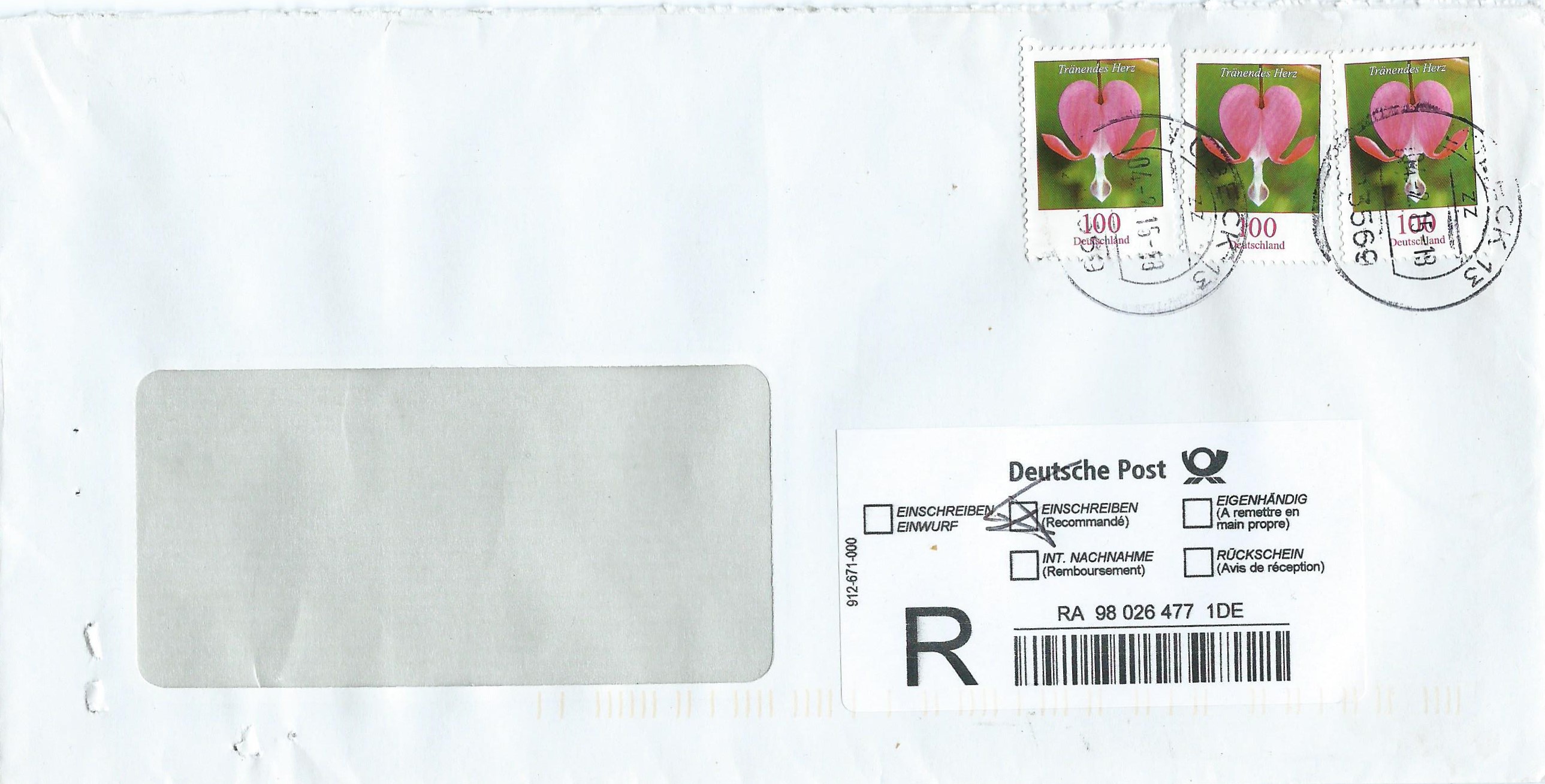 Heute beginne mal mit einer Mehrfachfrankatur: 3 Werte der Blumendauerserie zu 1 € als Einschreiben-Frankatur. Das Porto setzt sich wie folgt zusammen: Brief bis 50 gr. 85 ct und 215 ct für (Übergabe-) Einschreiben sind genau die 3 verklebten Euro. Abgestempelt 23569 Lübeck 13 am 4.2.15.