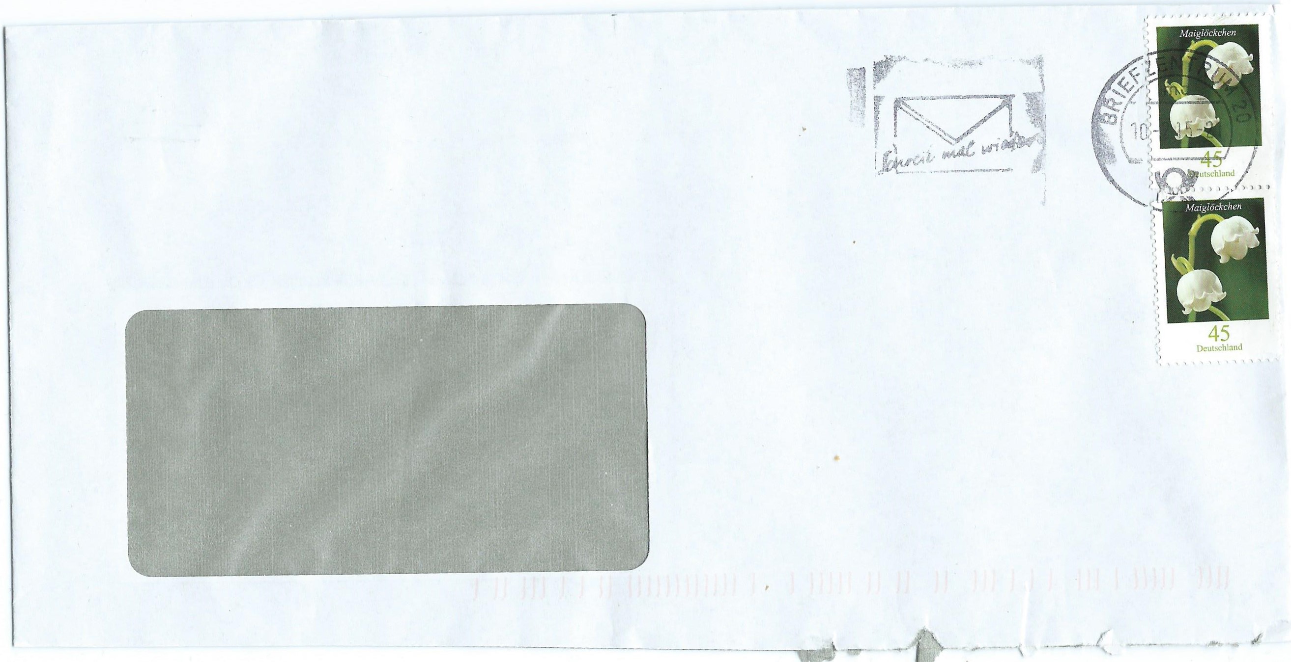 Gefolgt von einer weiteren Mehrfachfrankatur: 2 Werte zu 45 ct, was nach dem Tarif bis 31.12.2014 noch dem Brief von 20 bis 50 gr. entsprach. Da dieser Brief aber am 10.2.15 abgestempelt wurde, sind hier genau 5 ct zuviel an Porto drauf. 85 ct hätten gereicht ;)