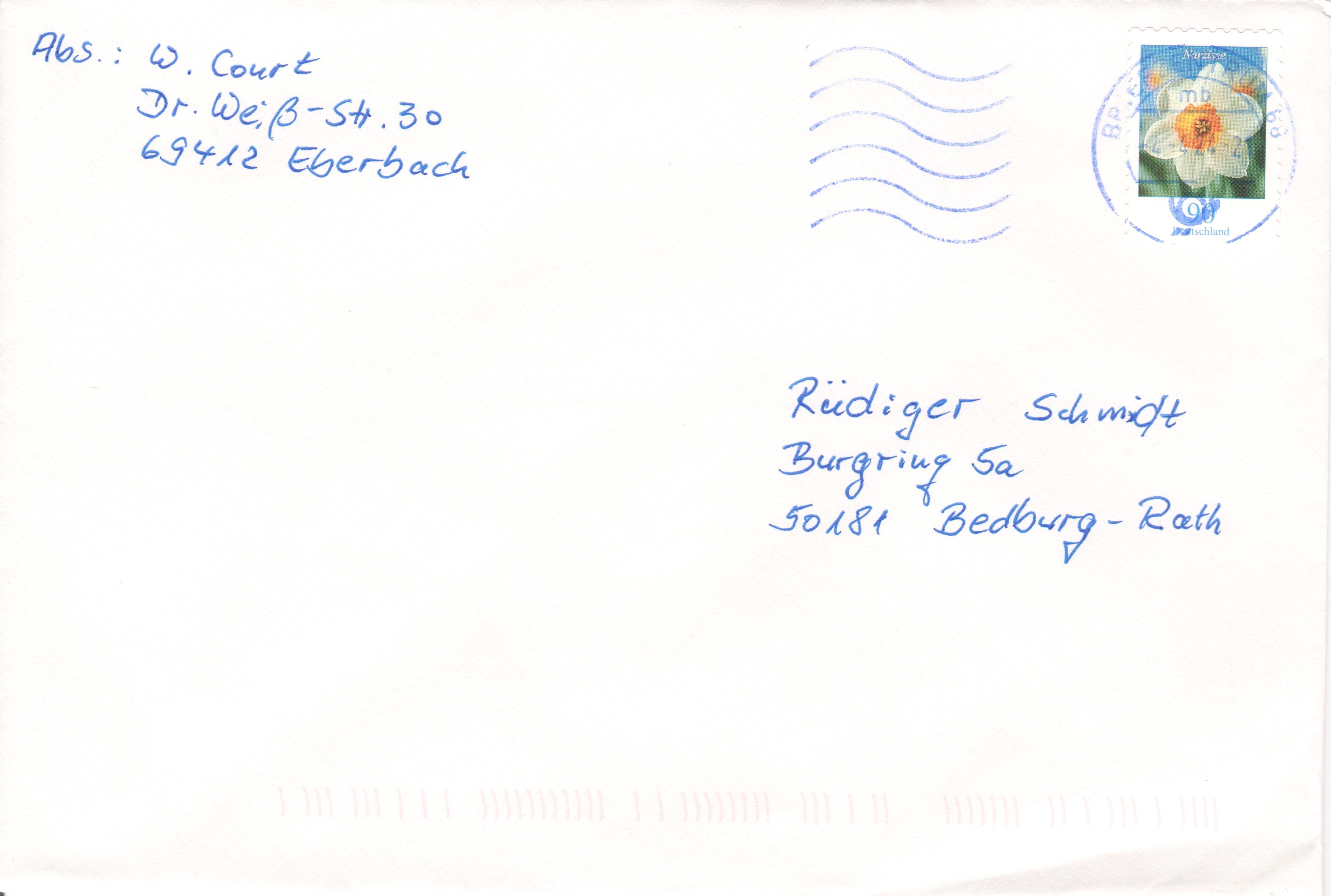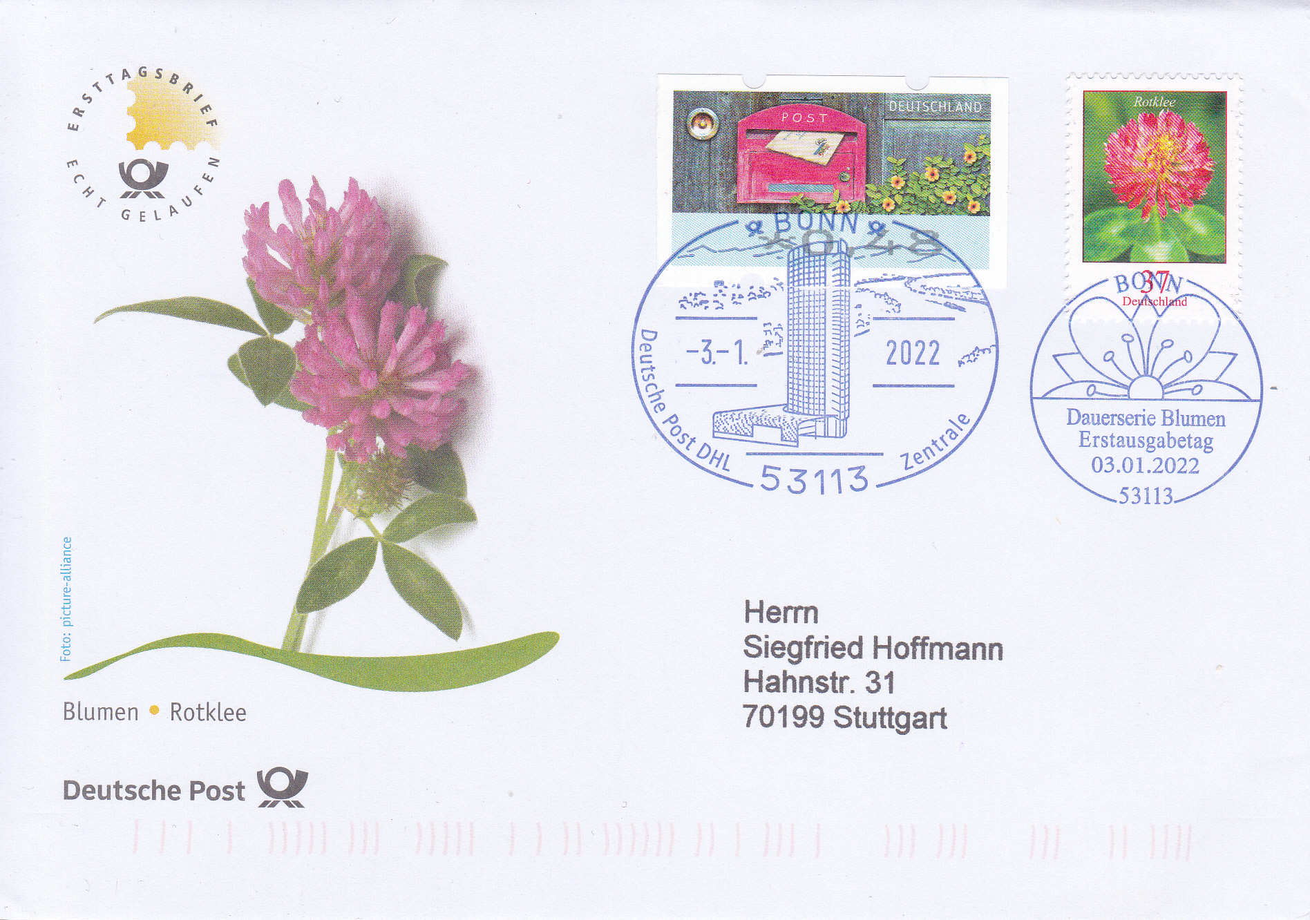 Ersttagsbrief mit der nassklebenden Marke zu 37 Cent-Marke (MiNr 3656) und der Zusatzfrankatur einer Automatenmarke zu 0,48€. Die Blumenmarke auf diesem Brief ist mit dem Ersttagsstempel Bonn entwertet, die Zusatzfrankatur mit einem Stempel der Deutschen Post DHL Zentrale in Bonn.