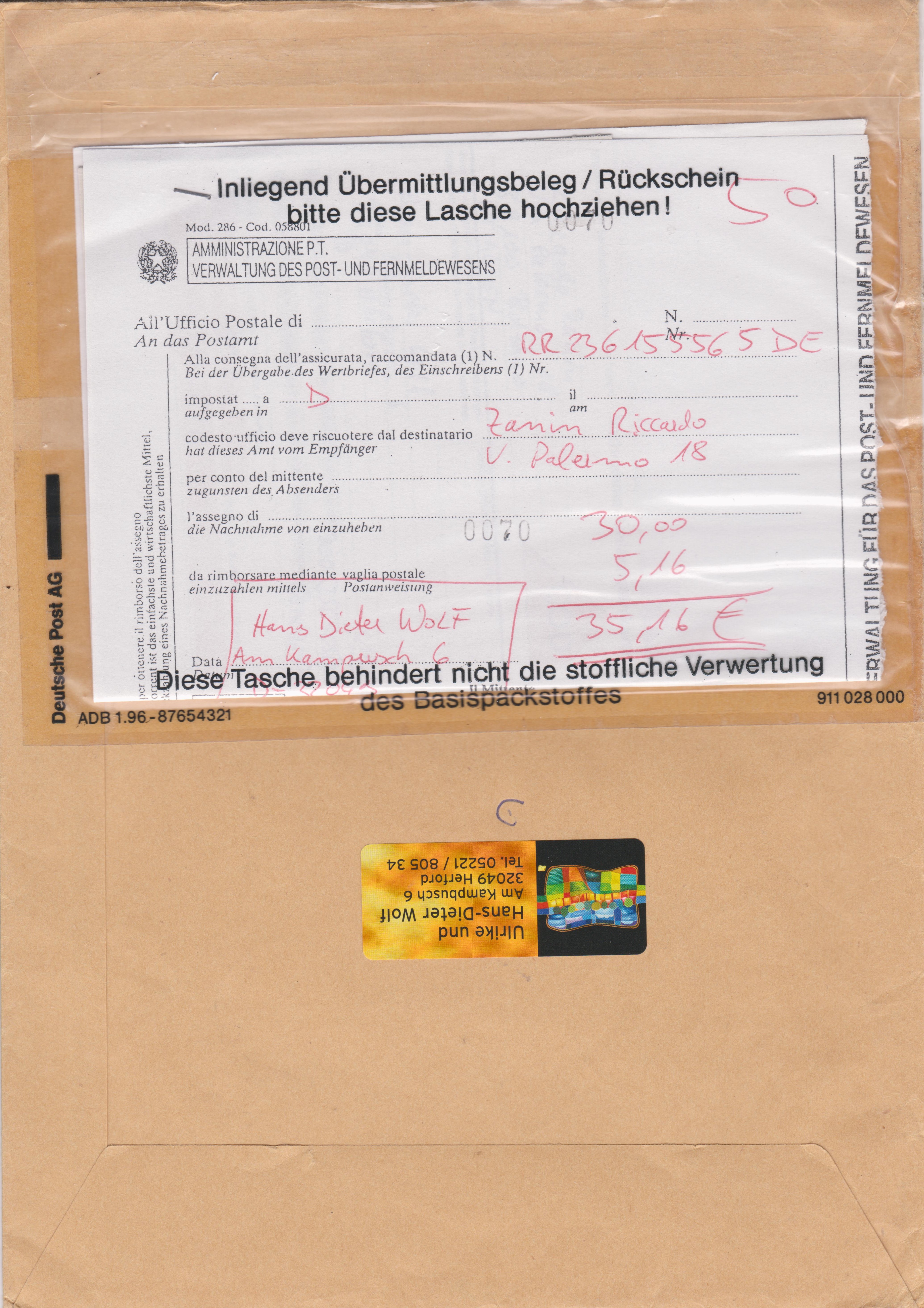 Zehnerbogen der Wertstufe 55 Cent am 31.12.2009 auf BLINDENSENDUNG per Einschreiben mit Nachnahme nach Italien: