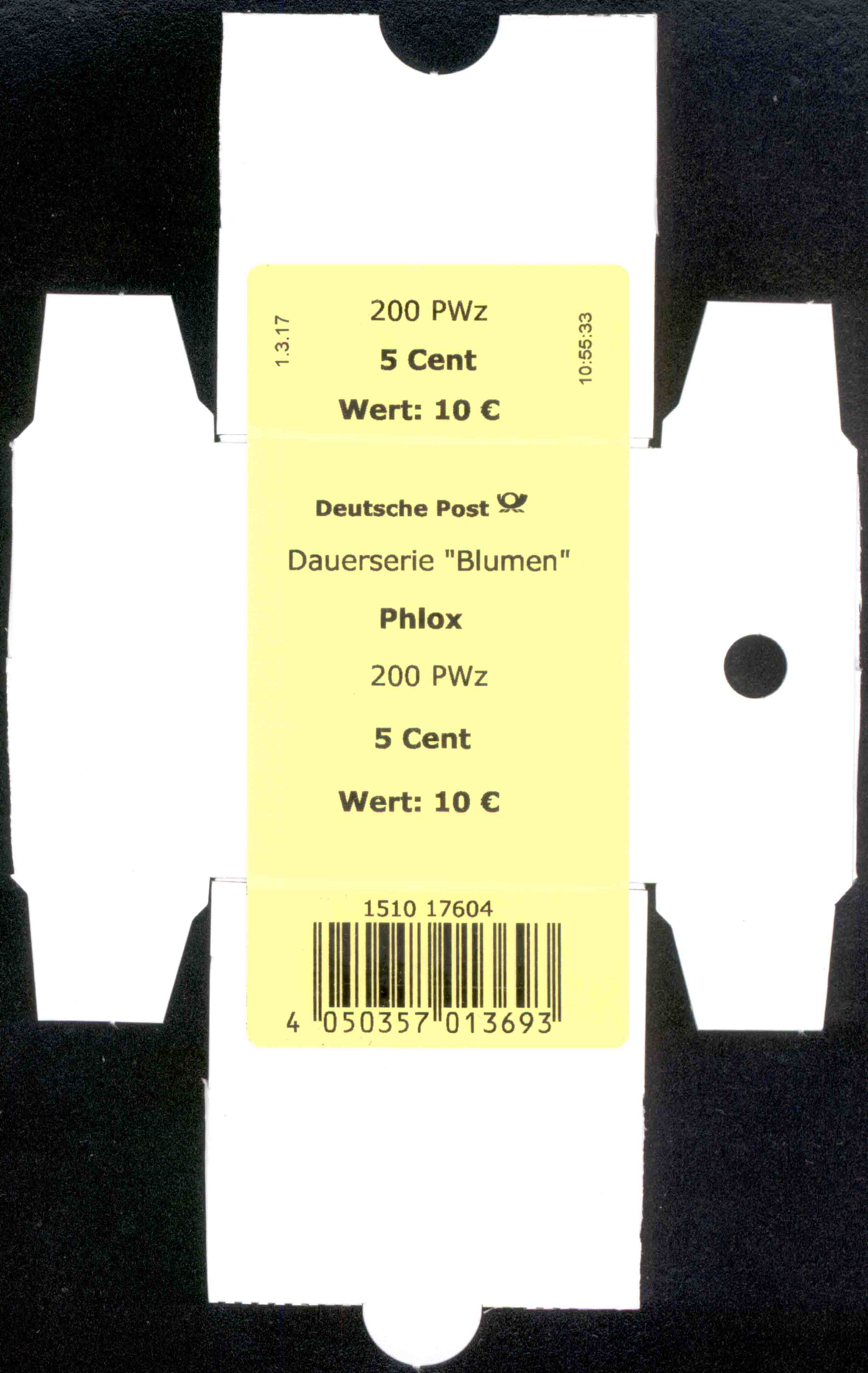Verpackung der 200er-Rolle des 5 ct Wertes Phlox, dessen Ersttag der 13.04.2017 ist: