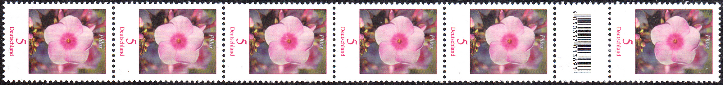 Hier zeige ich den Anfang einer 200er-Rolle mit dem 5 ct Wert Phlox (MiNr 3296) mit den Marken mit der Nummer 200 und 195 sowie Zwischenfeld mit der EAN-Codierung.