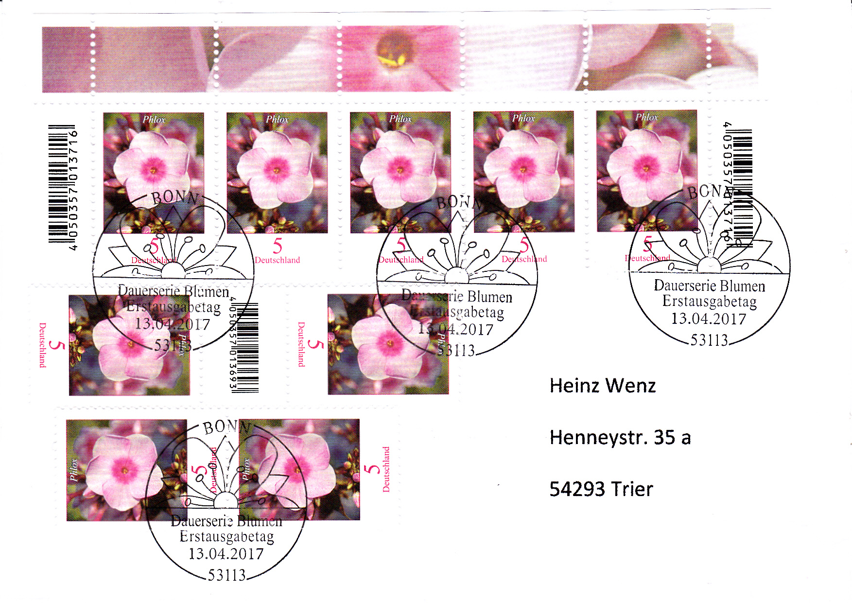 Diese Postkarte ist mit der oberen Bogenhälfte des 5 ct Wertes Phlox (MiNr 3296) und mit zwei Paaren aus der Rolle, eines davon mit Zwischenfeld mit der EAN-Codierung, frankiert und mit dem Ersttagsonderstempel Bonn abgestempelt.