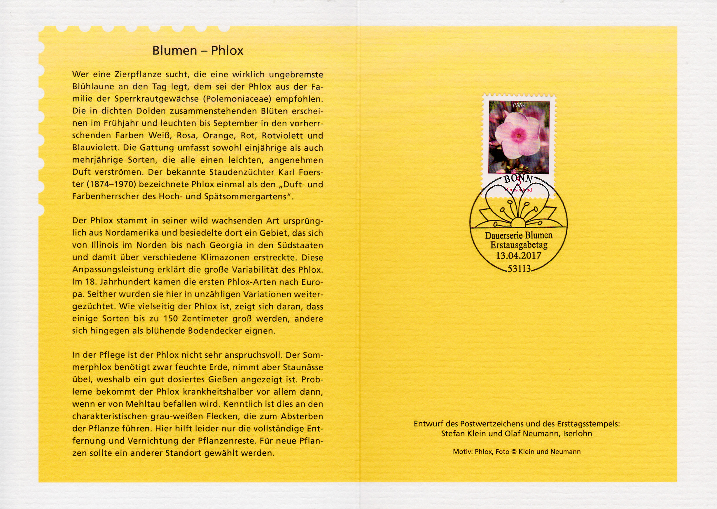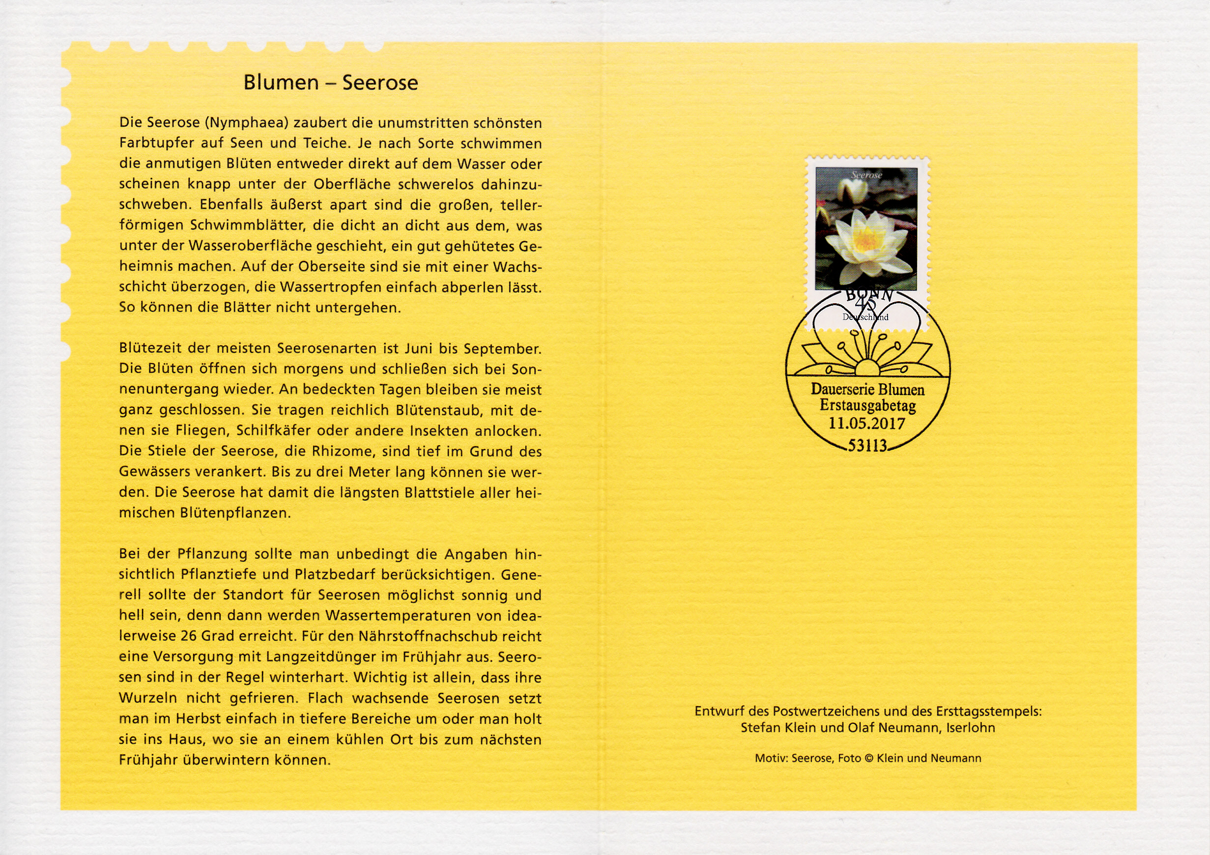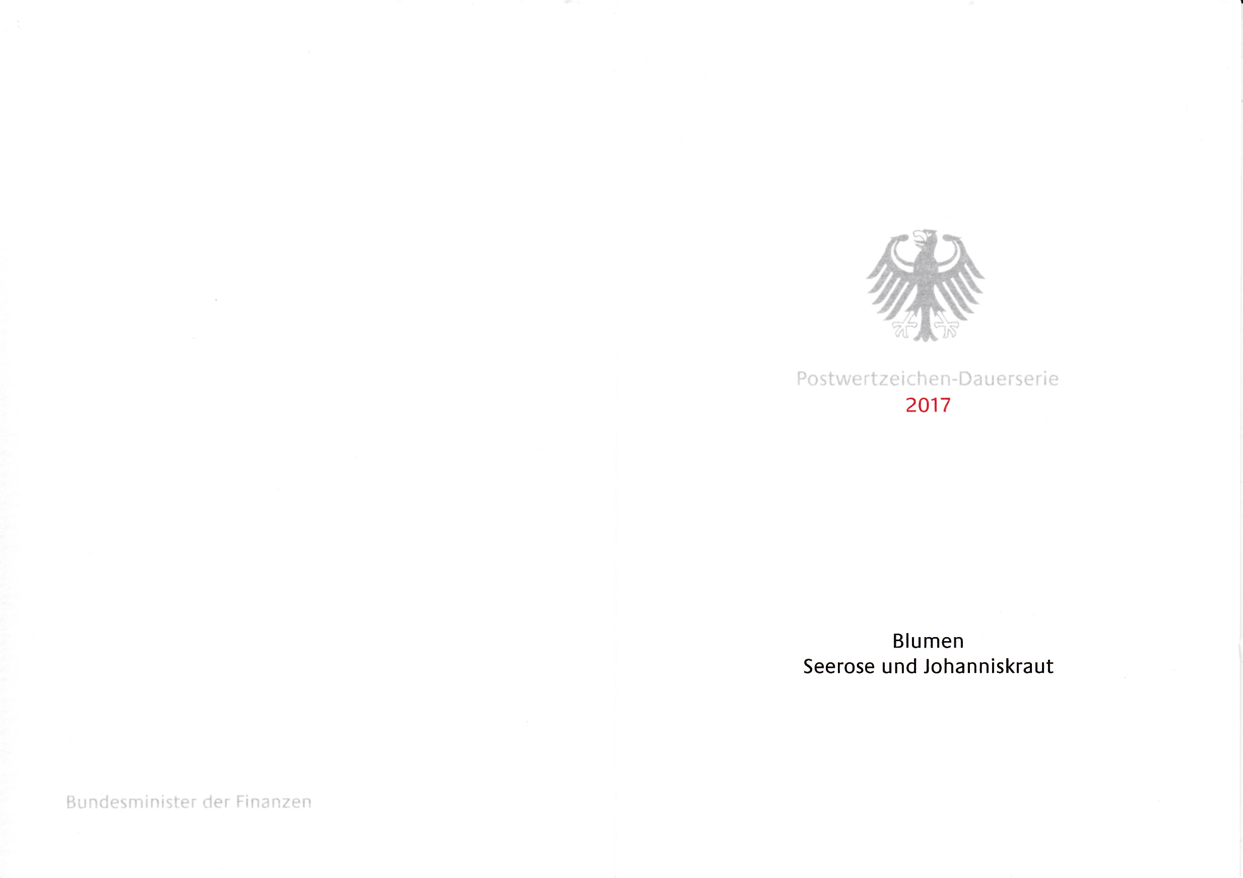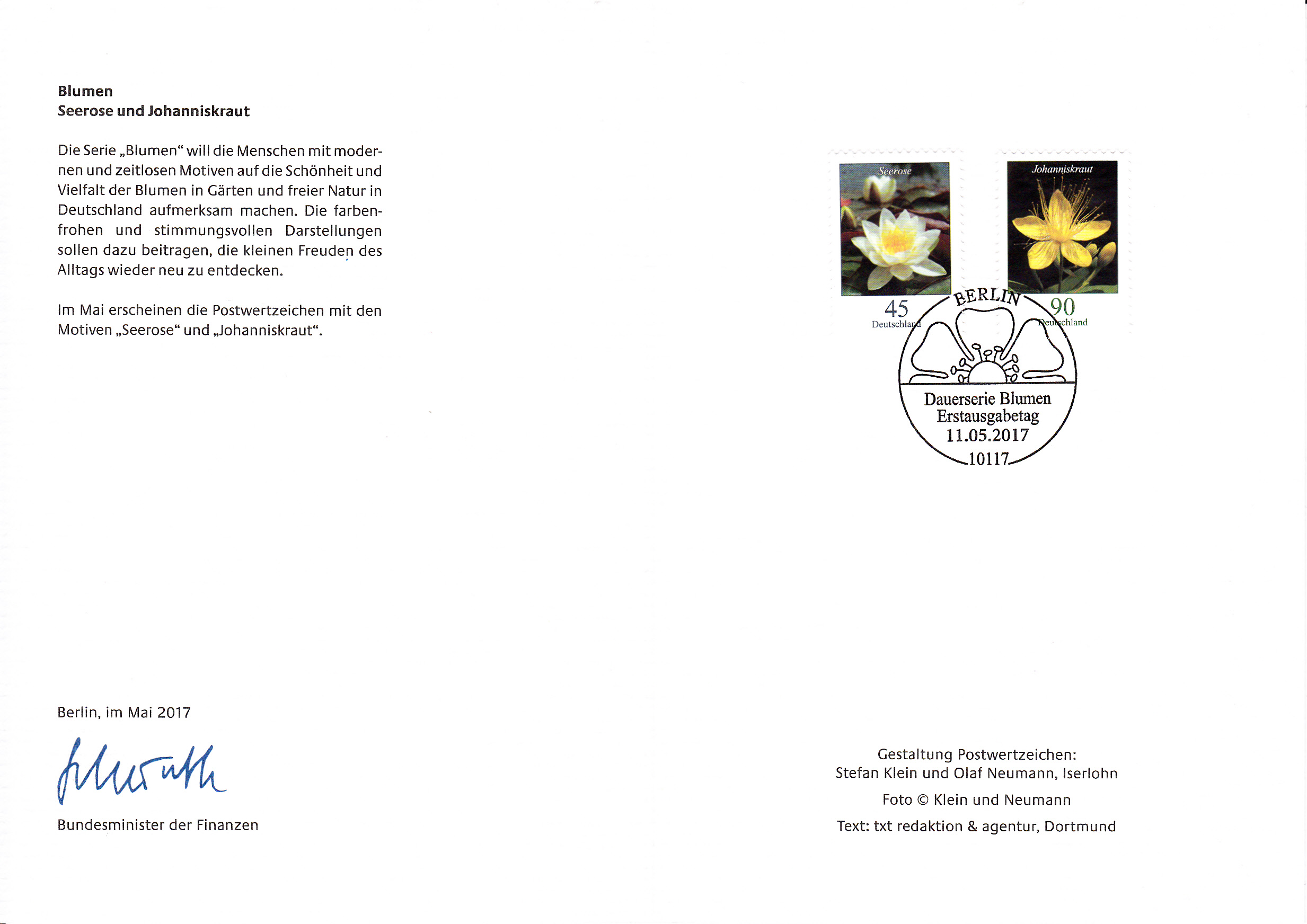 Bei der Ministerkarte des Finanzminister sind mit der 45 Cent-Marke mit dem Motiv "Seerose" (MiNr 3303) und der Marke zu 90 Cent mit dem Motiv "Johanniskraut" (MiNr 3304) beide Marken aus der Serie "Blumen" vom Ausgabetag 11.Mai 2017 mit dem Ersttagsonderstempel Berlin gestempelt.