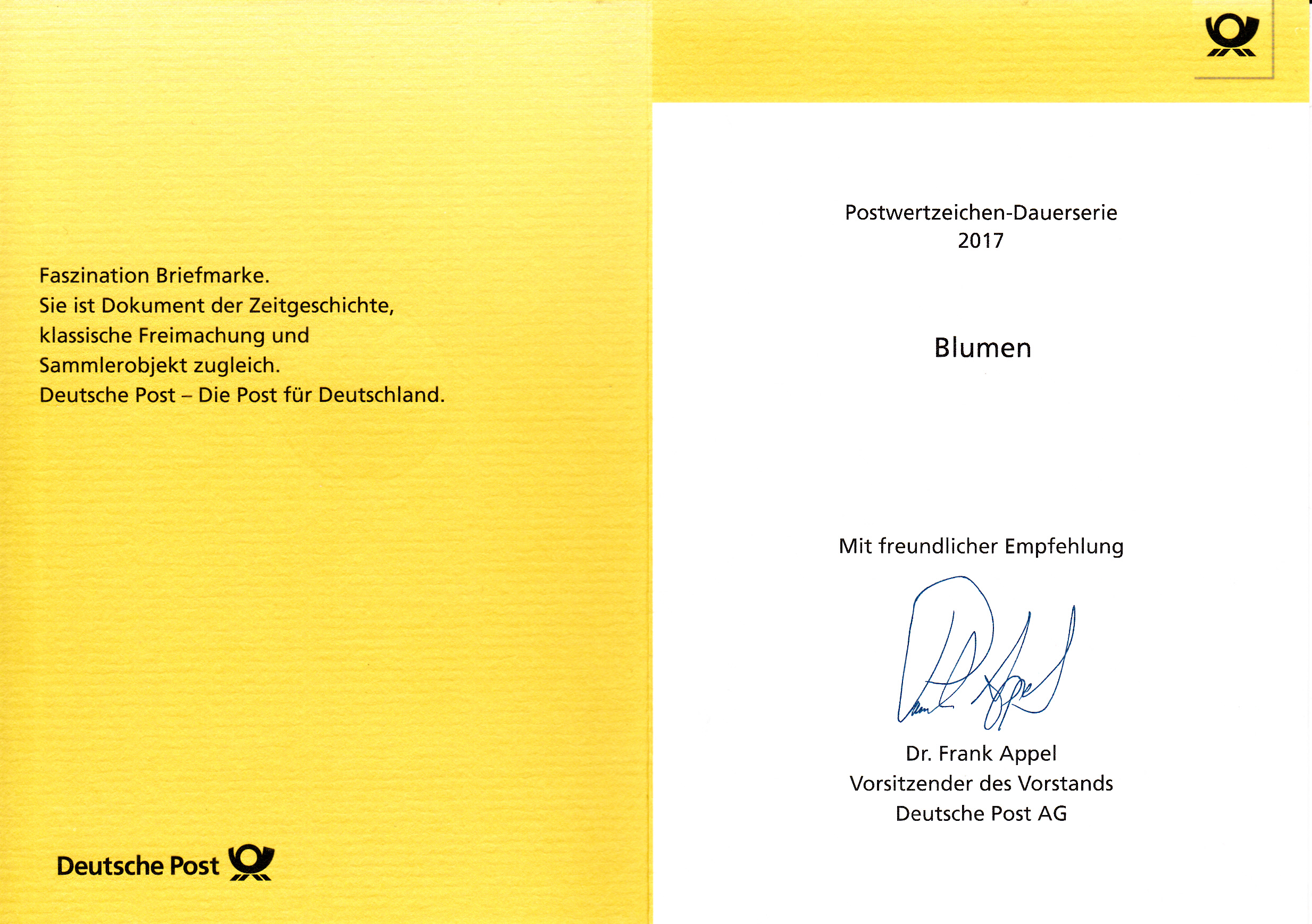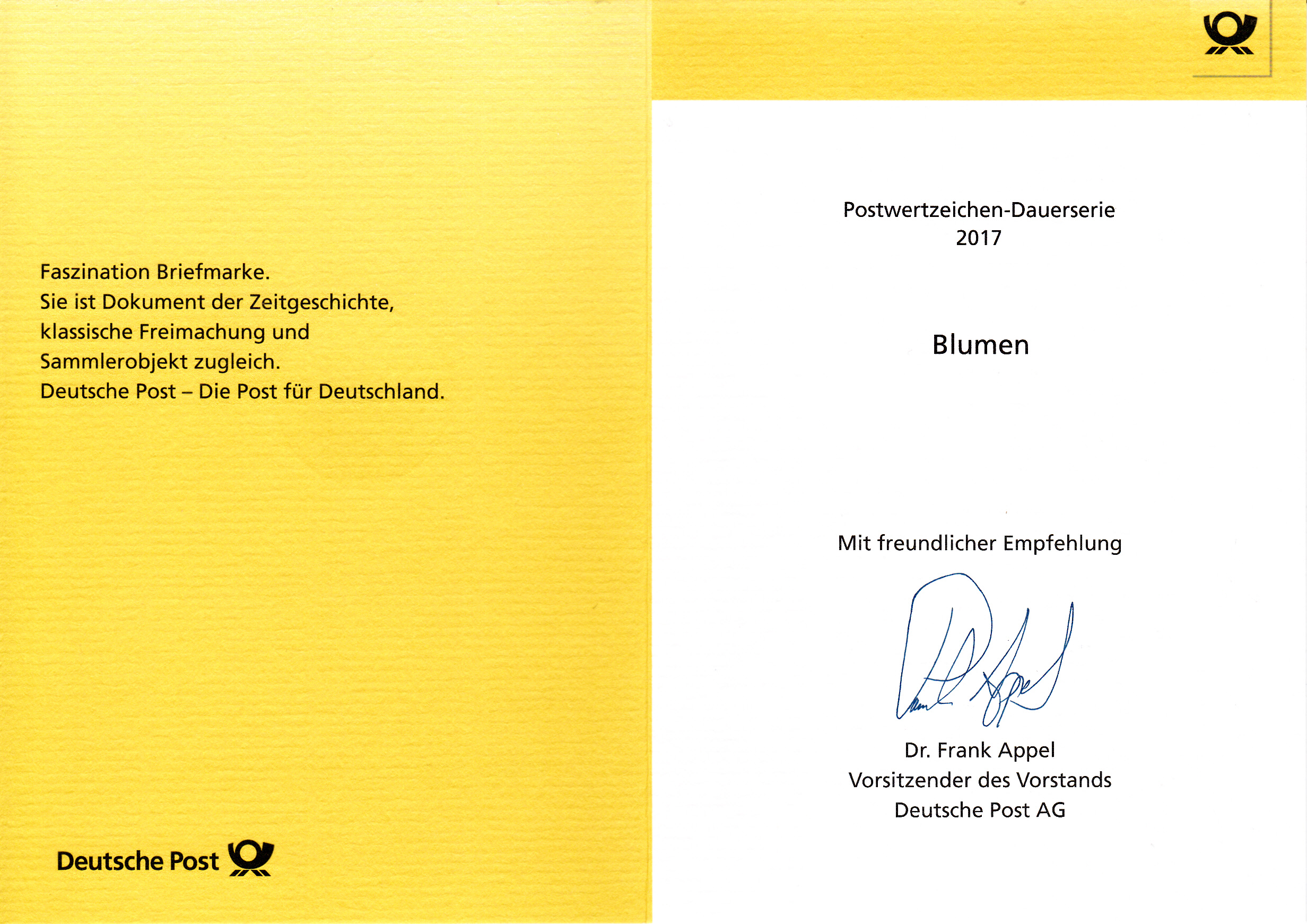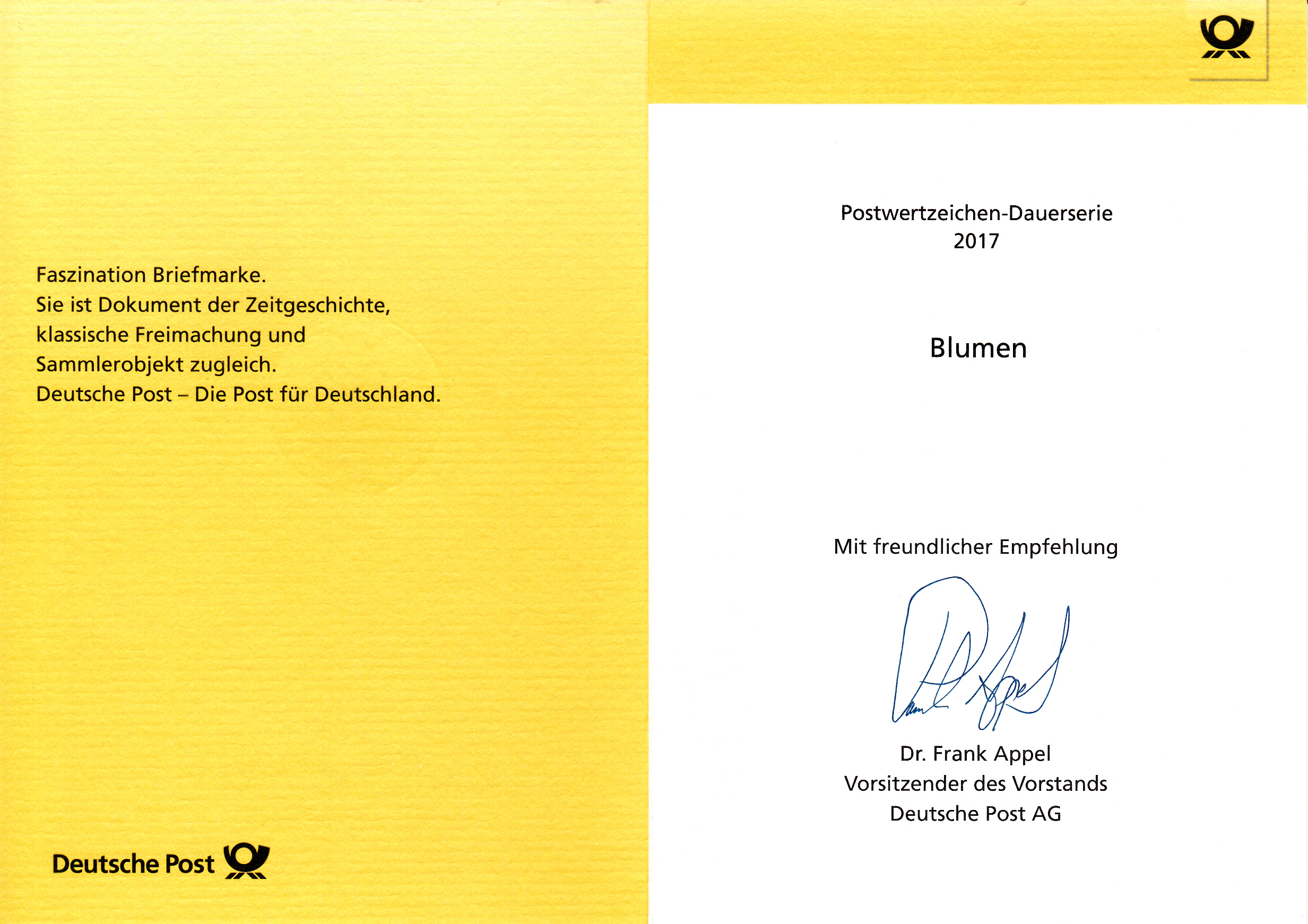 Klappkarte des Vorstandsvorsitzenden der Deutschen Post AG mit der Marke zu 90 Cent aus der Serie "Blumen" mit dem Motiv "Johanniskraut" (MiNr 3304) und dem Ersttagstempel aus Bonn.