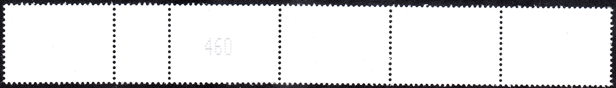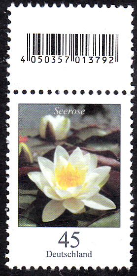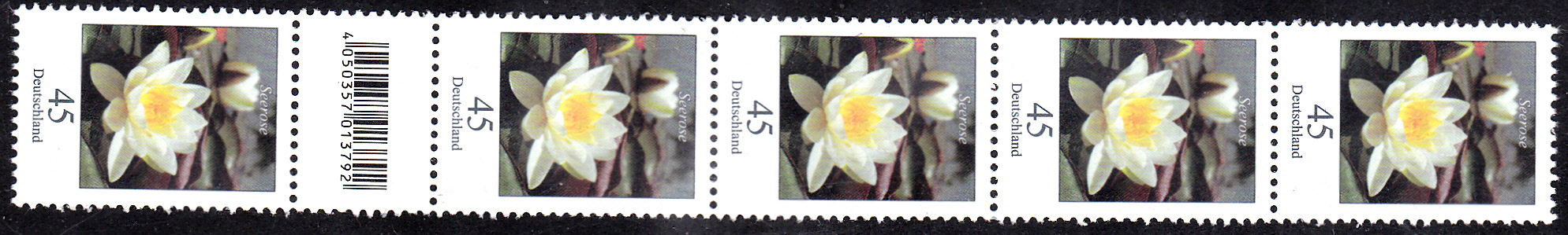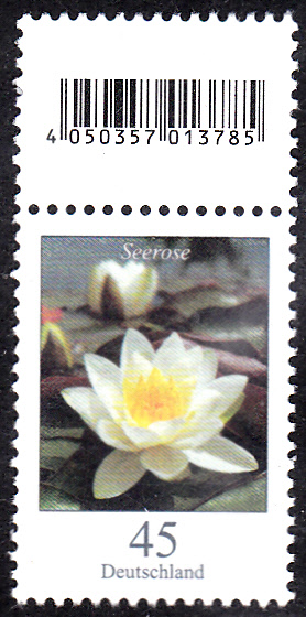 Die Marke zu 45 Cent aus der Serie "Blumen" mit dem Motiv "Seerose" (MiNr 3303) ist auch in Rollen zu 500 Marken erschienen. Hier ein Streifen aus einer 500er-Rolle mit einem EAN-Code zwischen der 460. und 461. Marke.