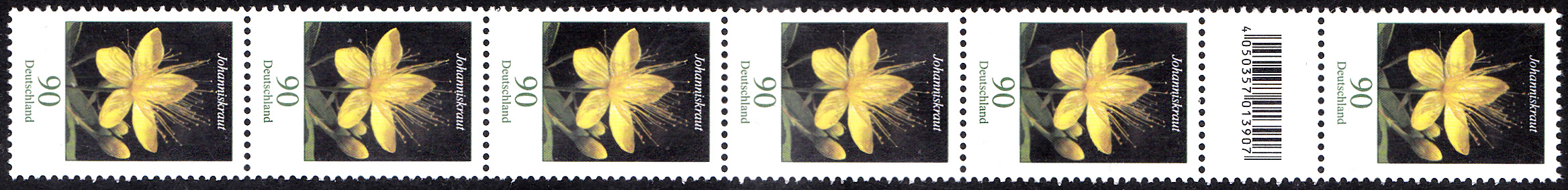 Die Marke zu 90 Cent aus der Serie "Blumen" mit dem Motiv "Johanniskraut" (MiNr 3304) ist auch in 200er-Rollen erschienen. Hier ein Streifen von sechs Marken aus einer 200er-Rolle mit einem EAN-Code zwischen der 180. und 81. Marke. Der EAN-Code ist "4 050357 013907".