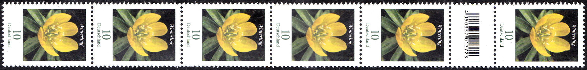 Die Marke zu 10 Cent aus der Serie "Blumen" mit dem Motiv "Winterling (Eranthis hyemalis)" (MiNr 3314) ist auch in 200er-Rollen erschienen. Hier ein Streifen von sechs Marken aus einer 200er-Rolle mit einem EAN-Code zwischen der 10. und 11. Marke. Der EAN-Code ist "4 050357 013723".