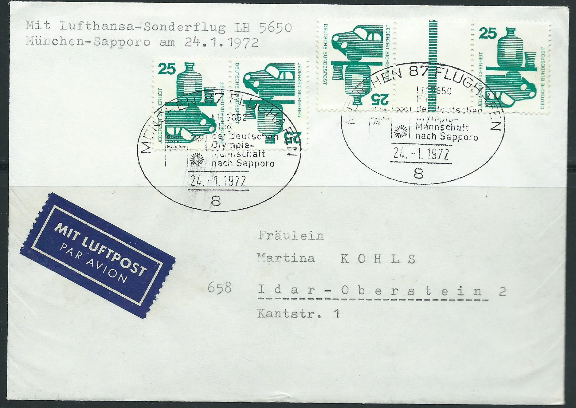 Immer wieder gerne genommen sind Zusammendrucke der Heftchenbogen auf Beleg. Hier sind die beiden Kehrdrucke der Wertstufe 25 Pf auf einem Luftpostbrief verklebt worden. Es sind die Zusammendruck-Nummern K 10 (25/25) und KZ 8 (25/Zwischensteg/25). Die Abkürzung K steht für Kehrdruck, die Abkürzung KZ für Kehrdruck mit Zwischensteg. Das ganze ist gestempelt mit einem Sonderstempel München 87 Flughafen "LH5650 Flug der deutschen Olympiamannschaft nach Sapporo" (zu den olympischen Winterspielen) vom 24.1.72.