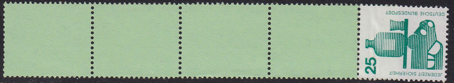 25Pf-Wert DS Unfallverhütung als Rollende mit einer Marke + vier Leerfelder in grün (MiNr 697 R RE 1+4Lf) postfrisch.