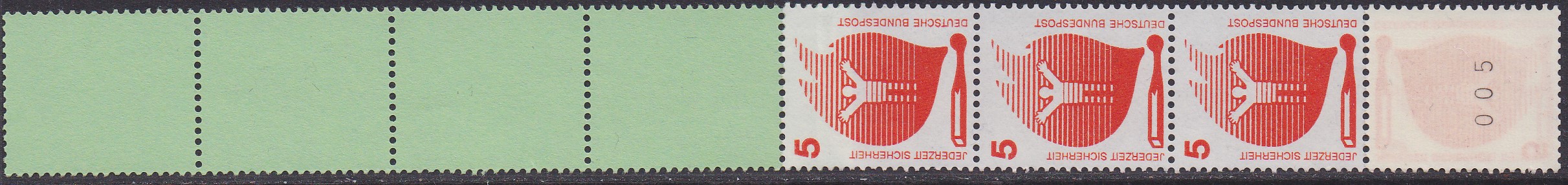 5Pf-Wert DS Unfallverhütung als Rollende mit fünf Marken + vier Leerfelder in grün (MiNr 694 R RE 5+4Lf a) mit schwarzer Zählnummer postfrisch.