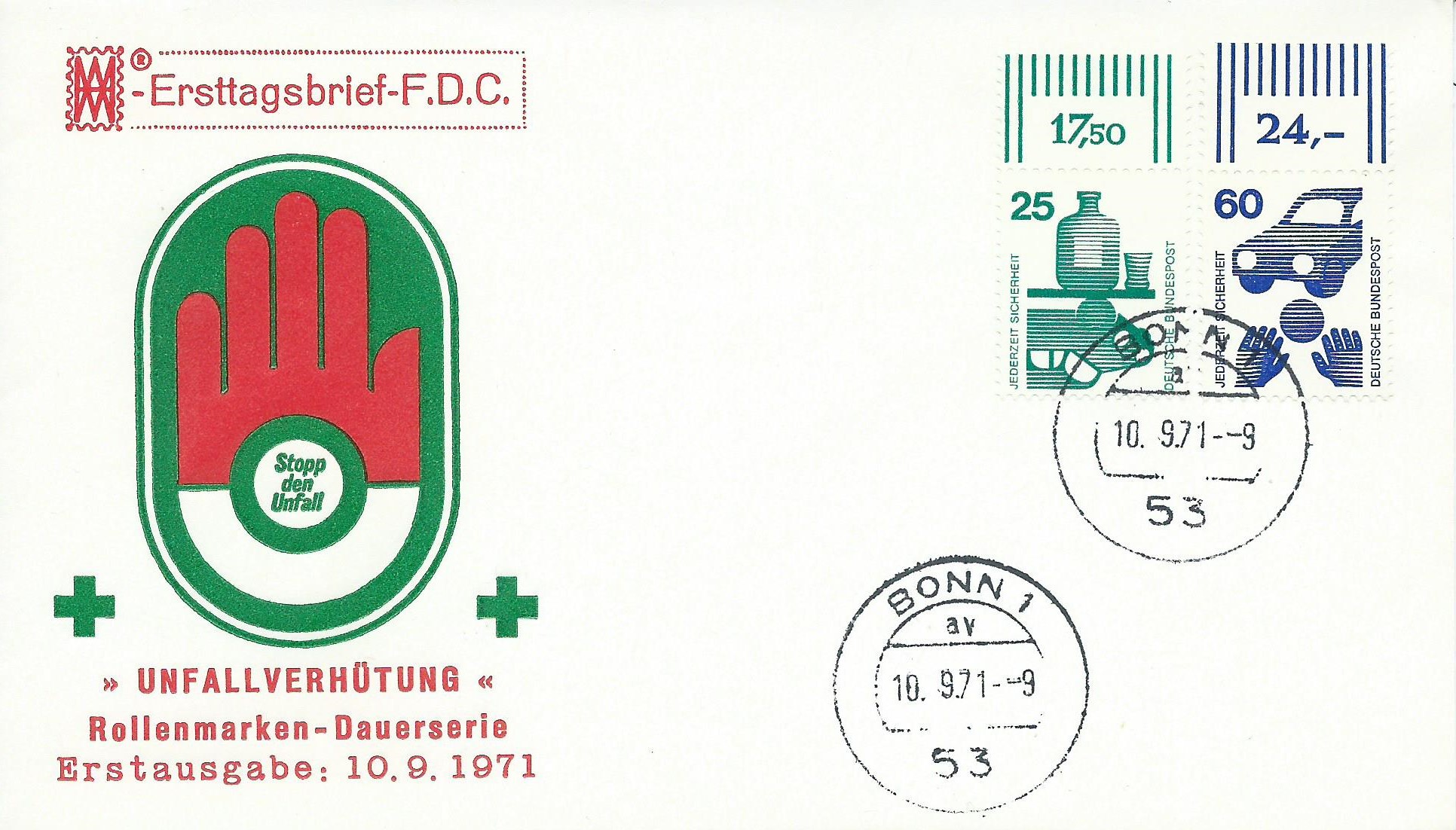 Dann noch ein Ersttagsbrief mit 2 Werten vom Oberrand. Es sind die Wertstufen 25 Pf mit Reihenwertzähler 17,50 und 60 Pf mit Reihenwertzähler 24,-, gestempelt Bonn 10.9.71: