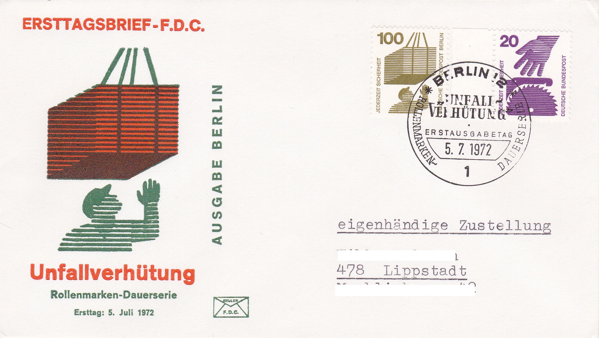 Brief vom Ersttag mit einer Marke vom linken Seitenrand zu 20Pf der DS "Unfallverhütung" (MiNr 696 A) und einer Marke zu 100Pf (Berlin MiNr 410). Der Bruef ist hoffnungslos überfrankiert, da ändert auch der Zusatz "eigenhändige Zustellung" nichts, da diese nur als Zusatzleistung bei Einschreiben, Wertsendung oder Paketen möglich war.