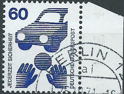 Der Wert zu 60 Pf vom rechten Seitenrand mit Stempel Berlin 12 vom 26.10.71. Der wird meine Sammlung erst mal nur als „Lückenbüßer“ bereichern, von der Qualität ist mir der oben abgerissene Rand nicht gut genug. In der Fehlliste bleibt er also weiter aufgelistet.