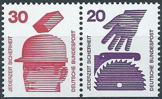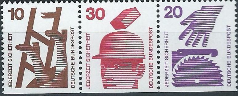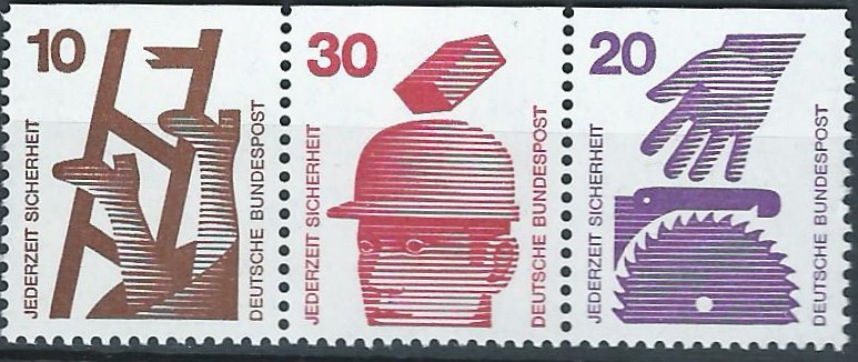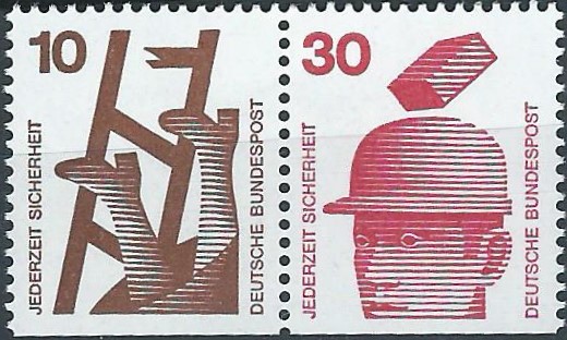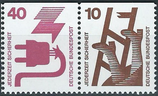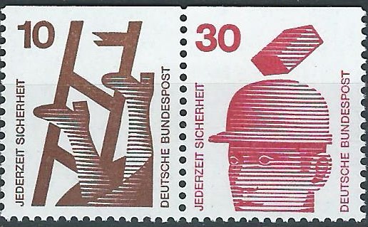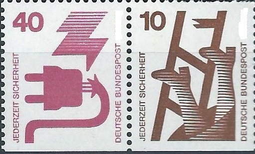 aus der Serie Unfallverhütung haben wir hier die Werte zu 30 und 50 Pf als Rollenende 1 + 4, also je eine Einzelmarke mit 4 anhängenden Leerfeldern. Gestempelt wurde in Rheda-Wiedenbrück mit einem Sonderstempel am 23.3.85.