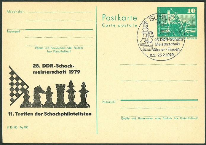 Auf dieser DDR-Gansache wurde ein Sonderstempel abgeschlagen, zu dessen Stempelinhalten nicht nur die Qualitäten Springer und Läufer gehören, sondern auch die Figur des Königs. Der Zudruck lenkt die Aufmerksamkeit auf ein Treffen von Schachphilatelisten. Ein hübsches, wenn auch philatelistisch geprägtes, Stück.