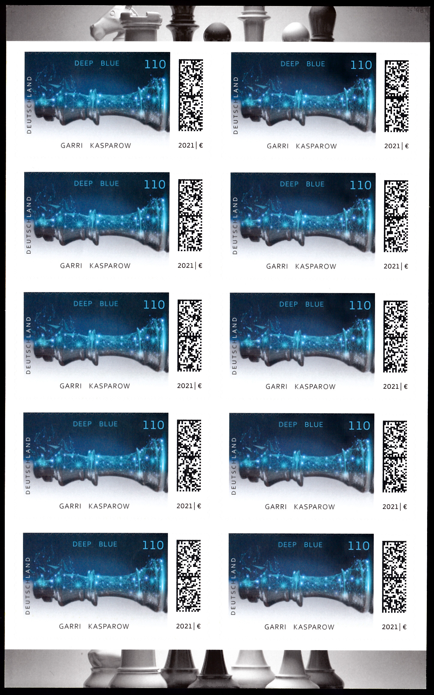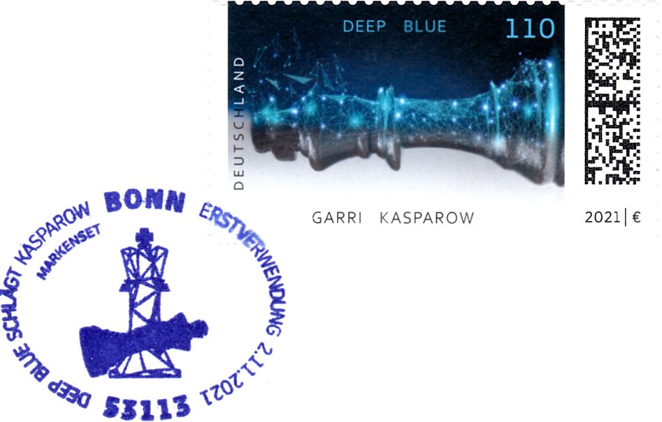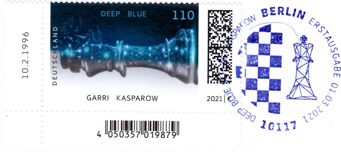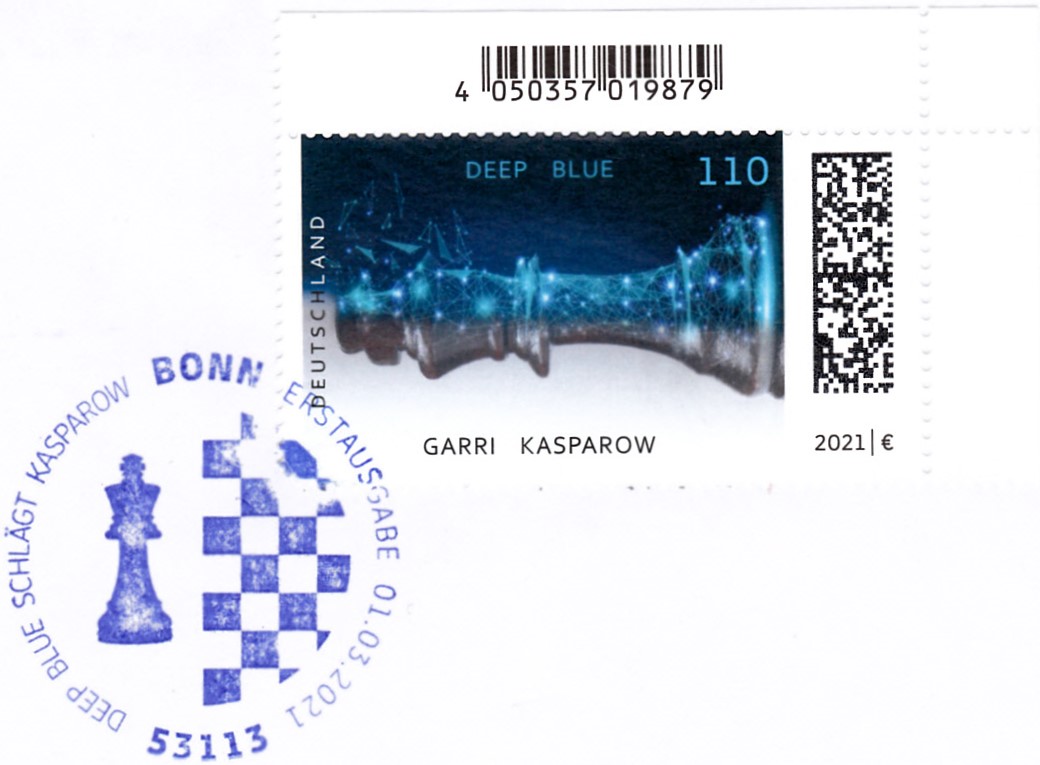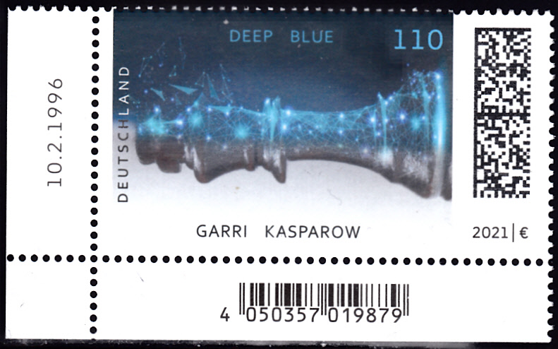 Bei der Deutschen Post ist 2021 eine Marke (MiNr 3595) zu "Schachcomputer Deep Blue schlägt Weltmeister Garri Kasparow". Sie zeigt einen geschlagenen König in physischer und digitaler Gestalt.