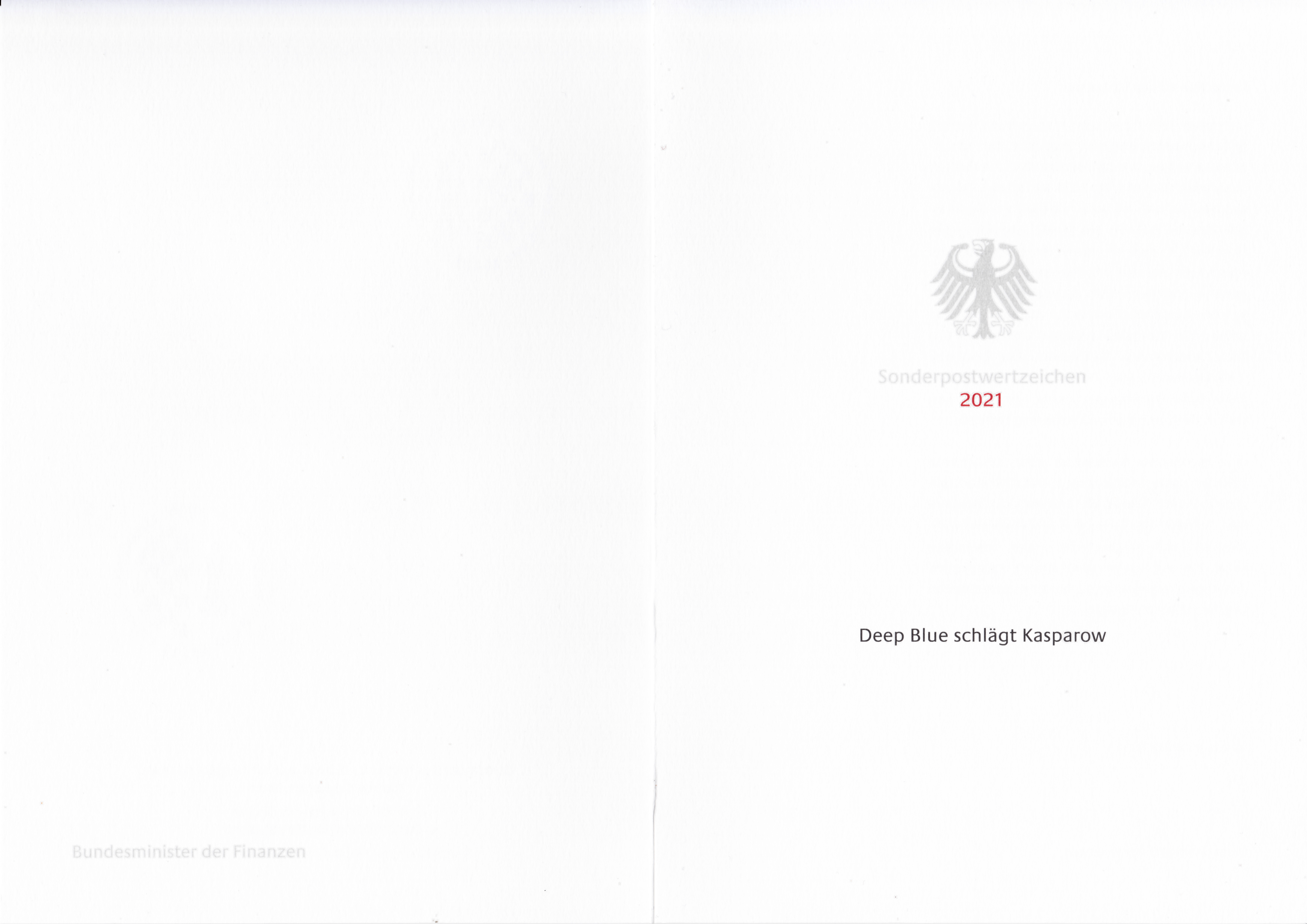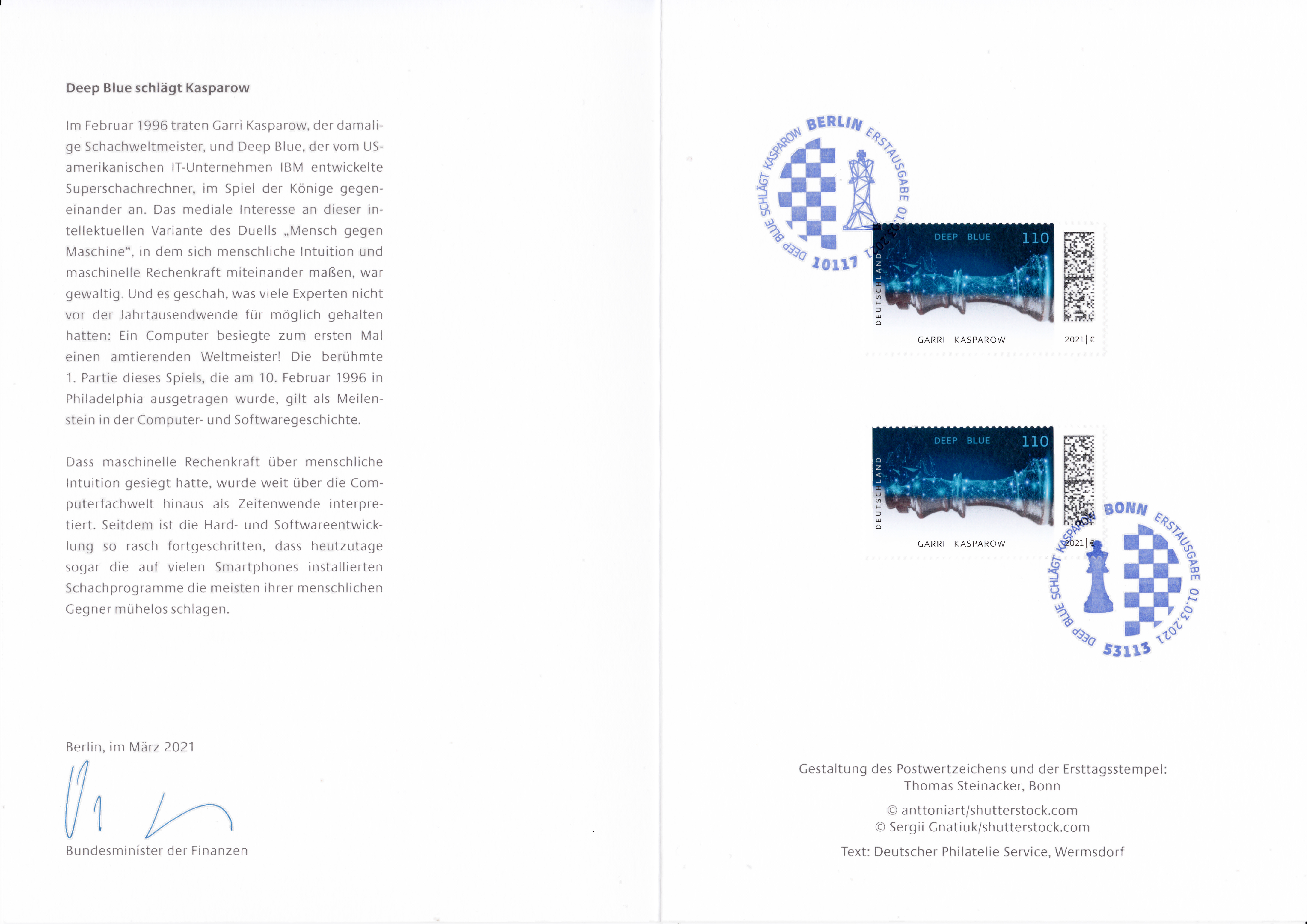 Klappkarte des Vorstandsvorsitzenden der Deutschen Post AG mit der Marke "Schachcomputer Deep Blue schlägt Weltmeister Garri Kasparow" (MiNr 2895) und dem Ersttagsonderstempel Bonn.