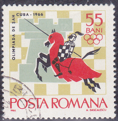 Aus einer Serie zur Schacholympiade 1966 in Havanna stammt diese Marke aus Rumänien (MiNr 2478) mit einer Weltkugel, den olympischen Ringe und einem Bauer vor einem Schachbrett.