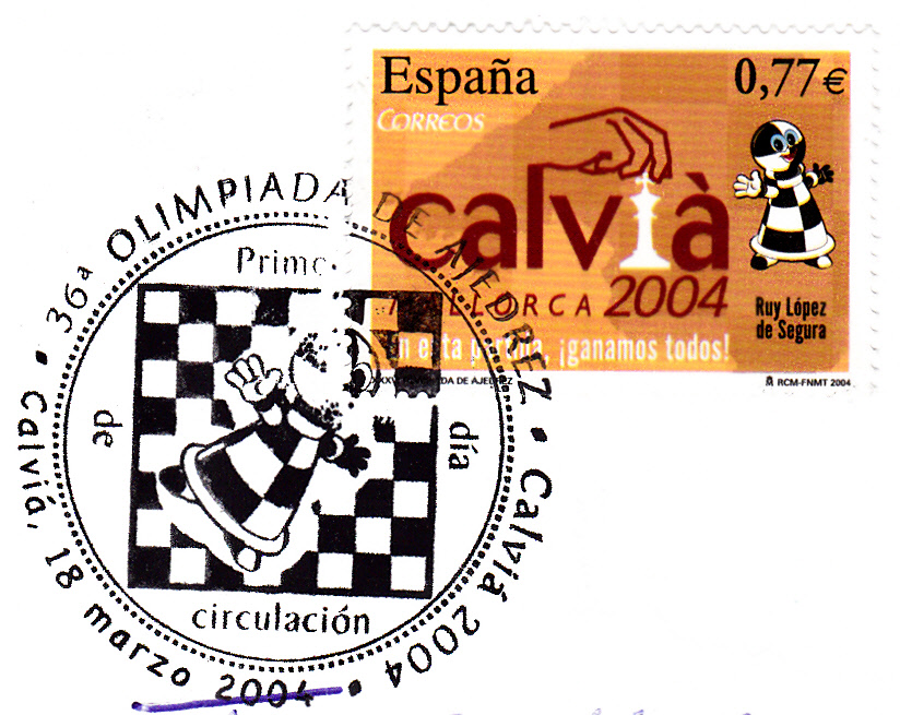 Am 18.3.2004 erschien in Spanien eine Sondermarke (MiNr 3936) zur 36. Schacholympiade. Hier eine Marke mit einem Ersttagsonderstempel aus Calvia. Im Markenbild ist eine Abbildung "Hand zieht König" und das Maskottchen "Peonín" zu sehen, im Stempelbild das Maskottchen vor einem Schachbrett.
