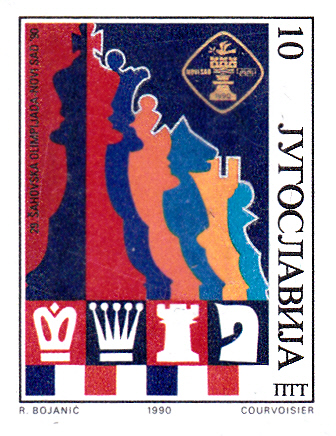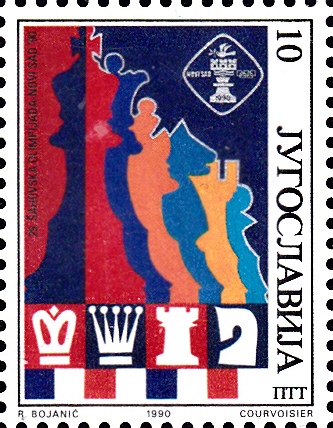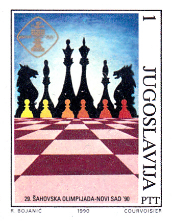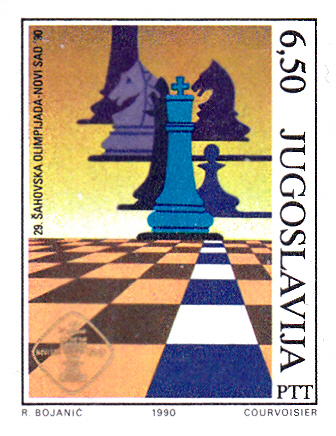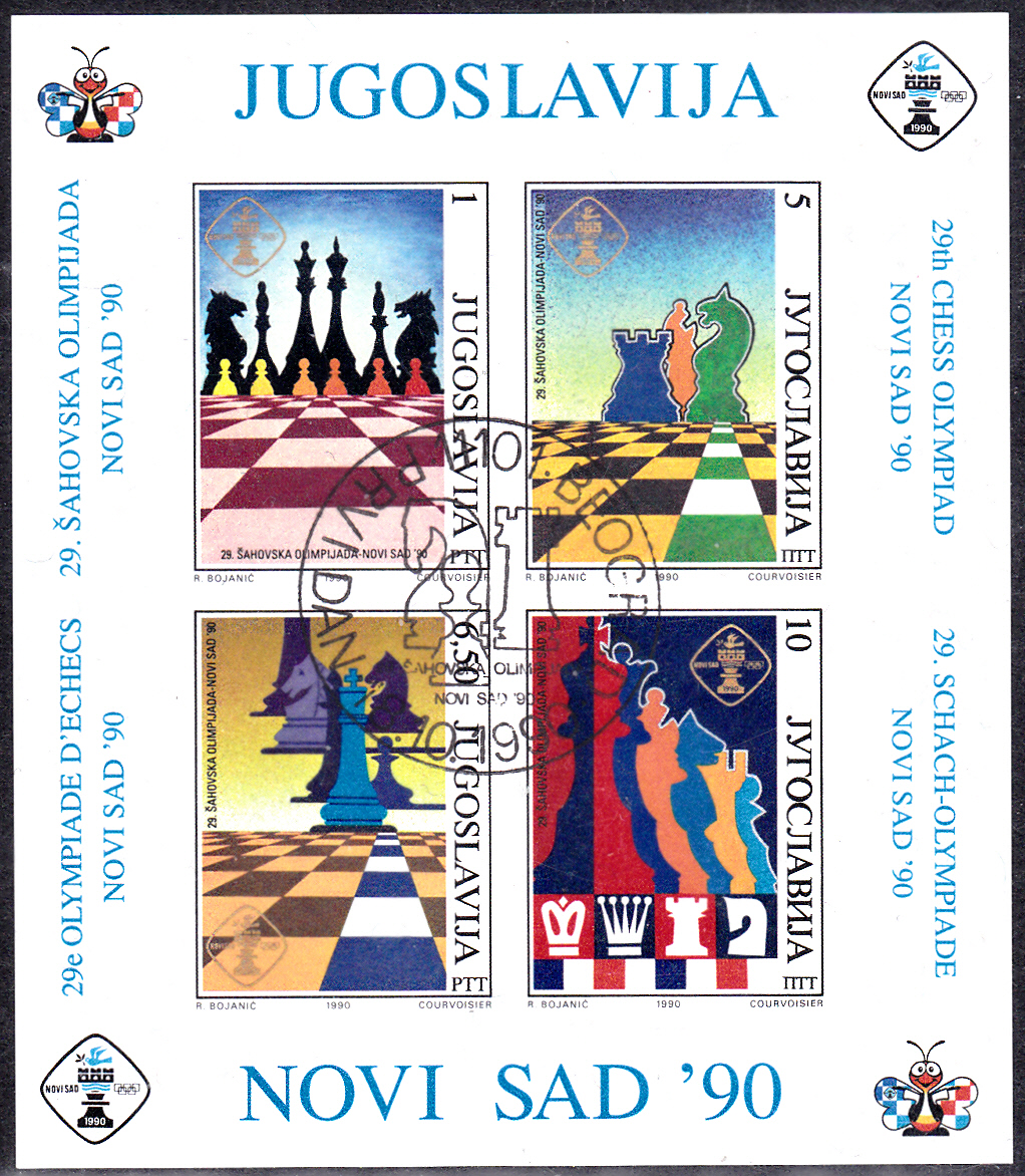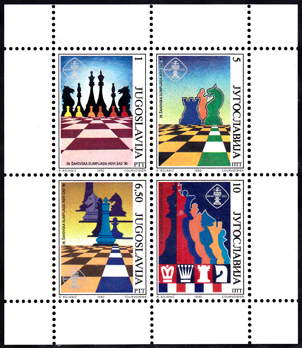Ich will heute mal bereits im Jahr 2015 von Matthias begonnene Vorstellung der Marken aus Jugoslawien zur Schach-Olympiade 1990 in Novi Sad vervollständigen. Gezeigt wurden bereits die Marken MiNr 2443 bis 2445. Heute ergänze ich hier eine vierte Marke (MiNr 2446) mit weiteren Schachfiguren.