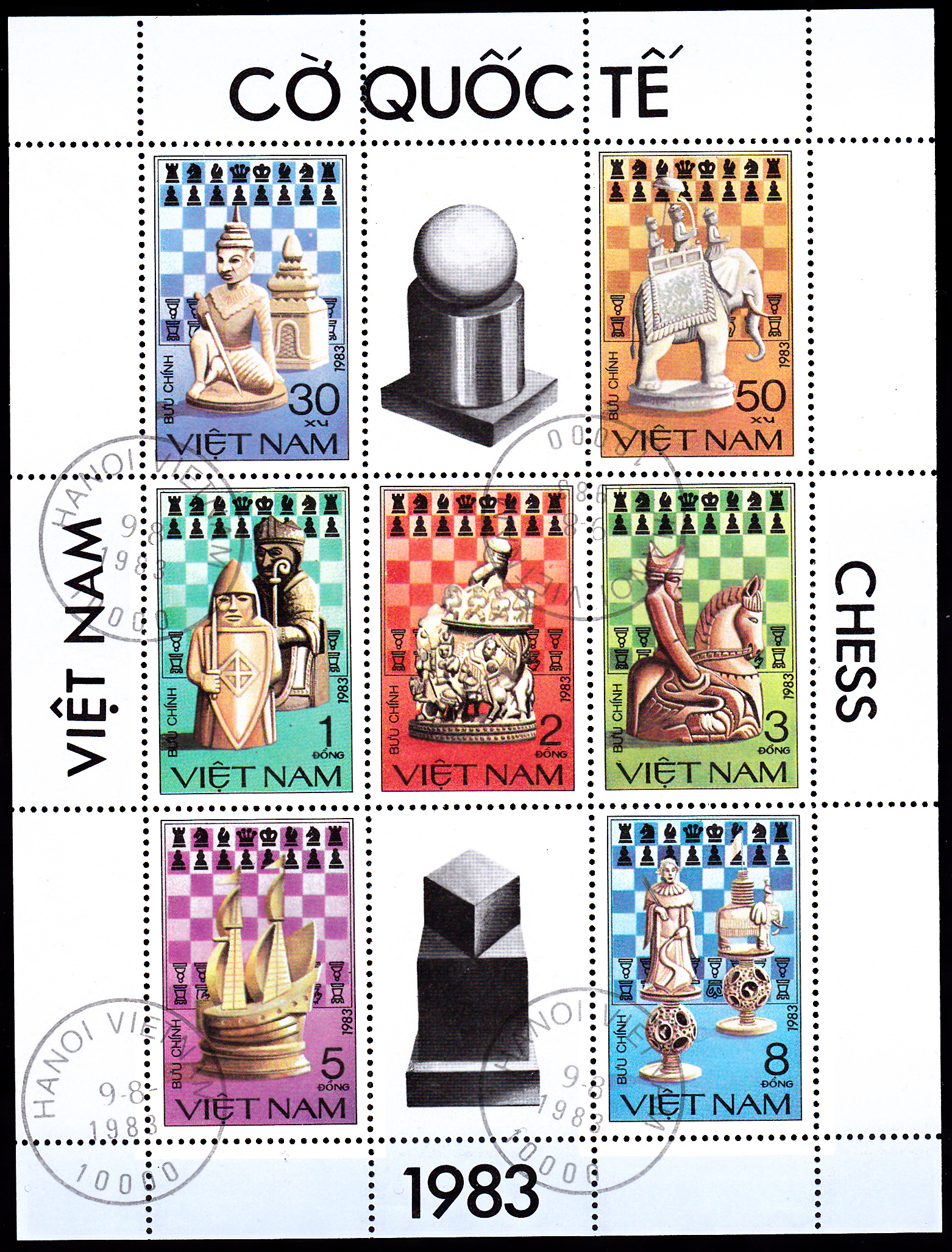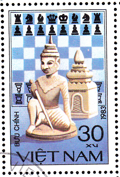 Diese Marke aus Vietnam )MiNr 1335) zeigt uns Vietnamesische Schachfiguren. Die hintere Figur stellt offensichtlich einen Turm dar, die vordere Figur kann ich allerdings nicht zuordnen.