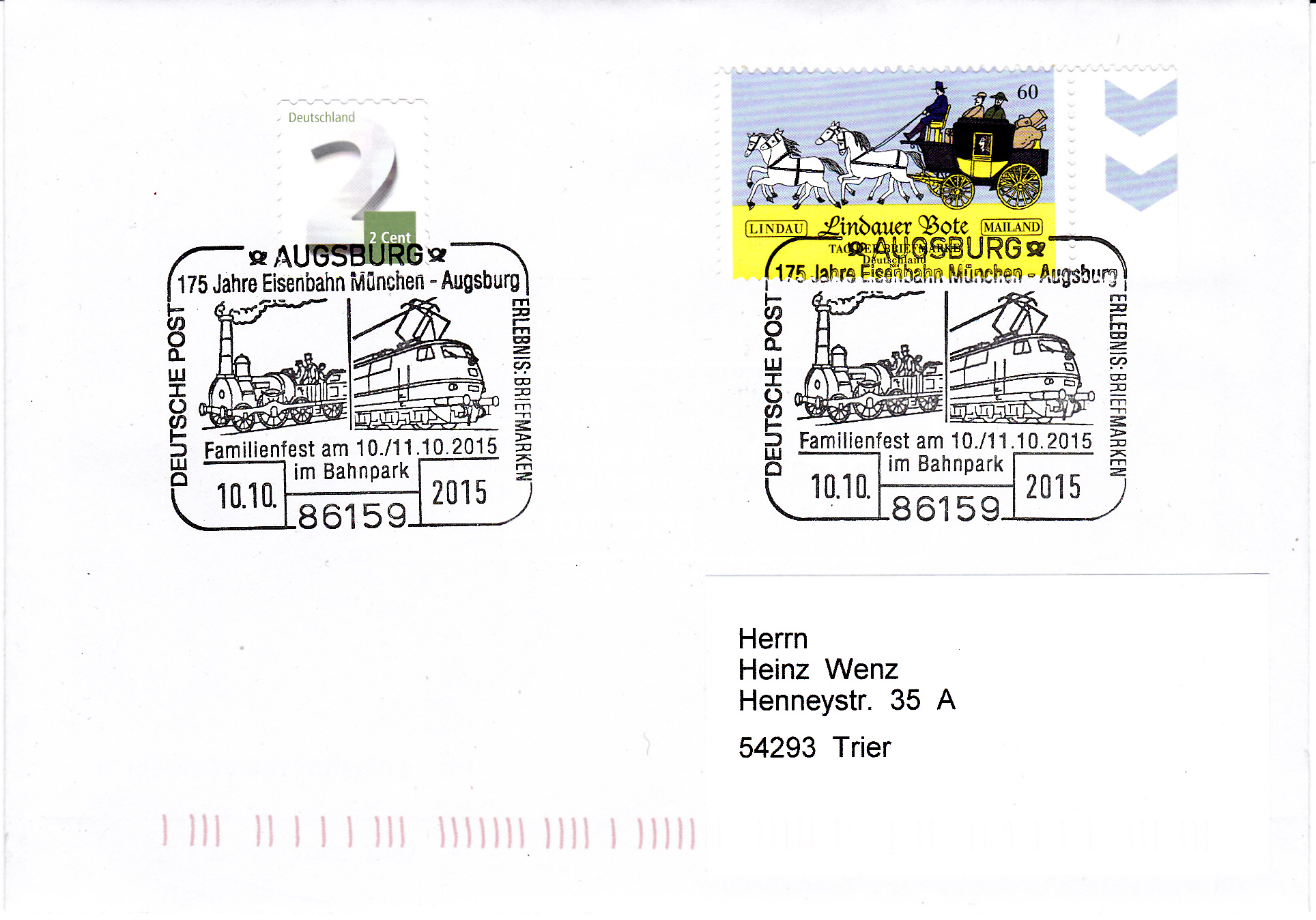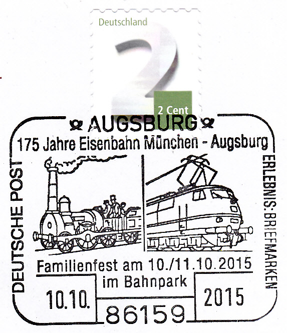 Sonderstempel vom 10.10.2015 aus 86159 Augsburg zum Jubiläum "175 Jahre Eisenbahn München-Augsburg". Im Stempelbild werden "Der Adler" und die E-Lok 103 gezeigt.