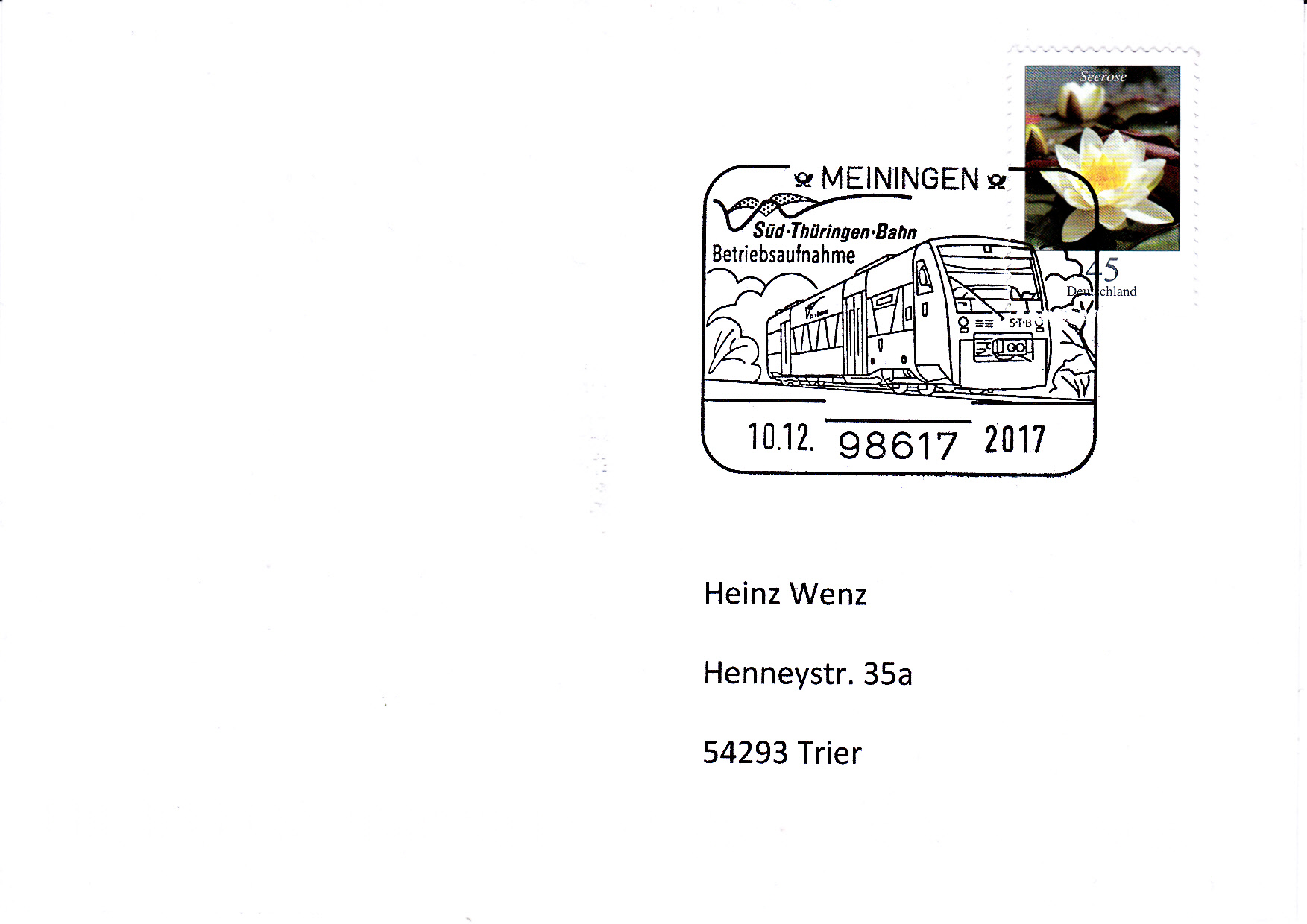 Zur Betriebsaufnahme auf der Strecke Erfurt – Zella-Mehlis – Meiningen am 10.12.2017 gab es in Meiningen auch einen Sonderstempel.