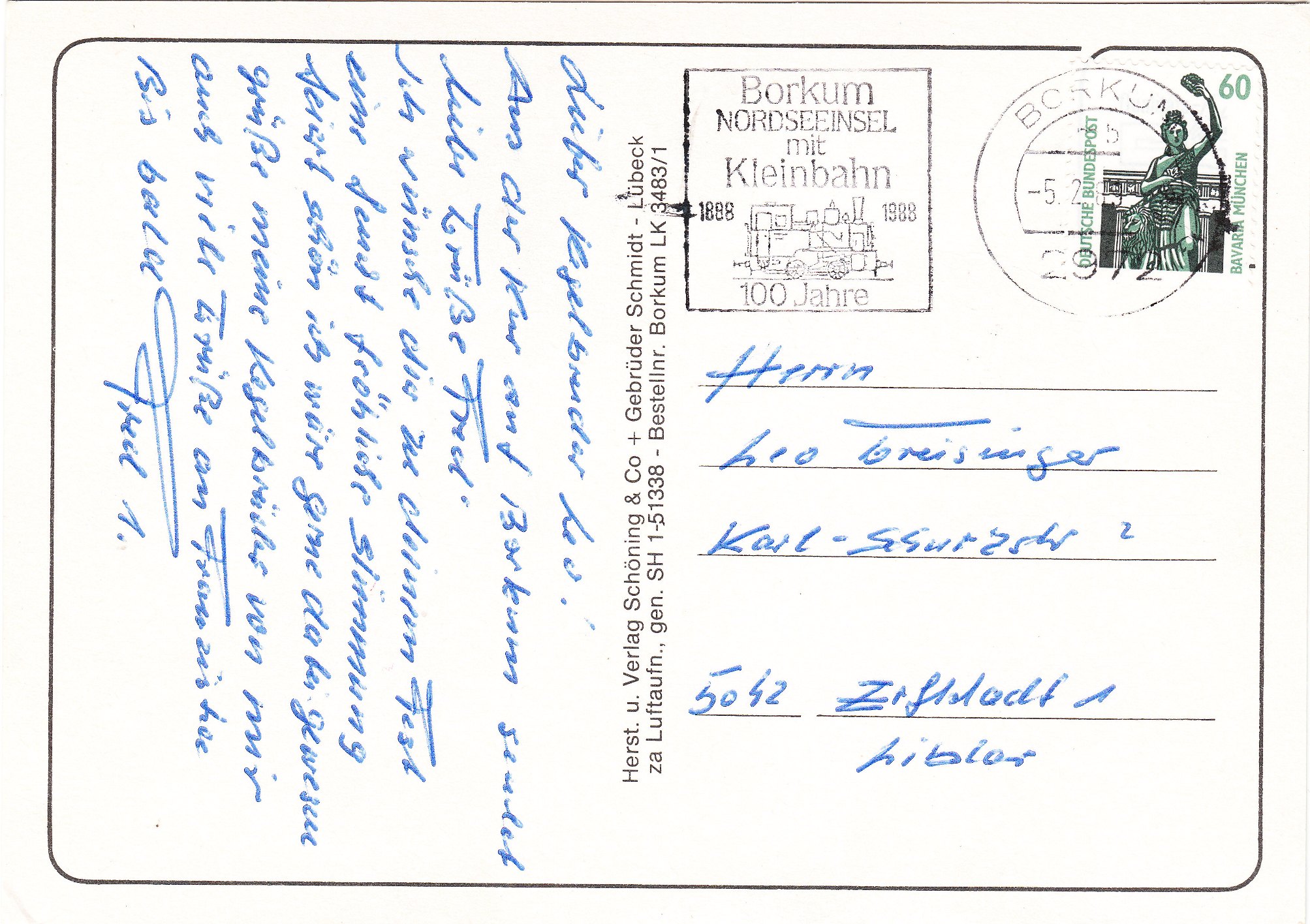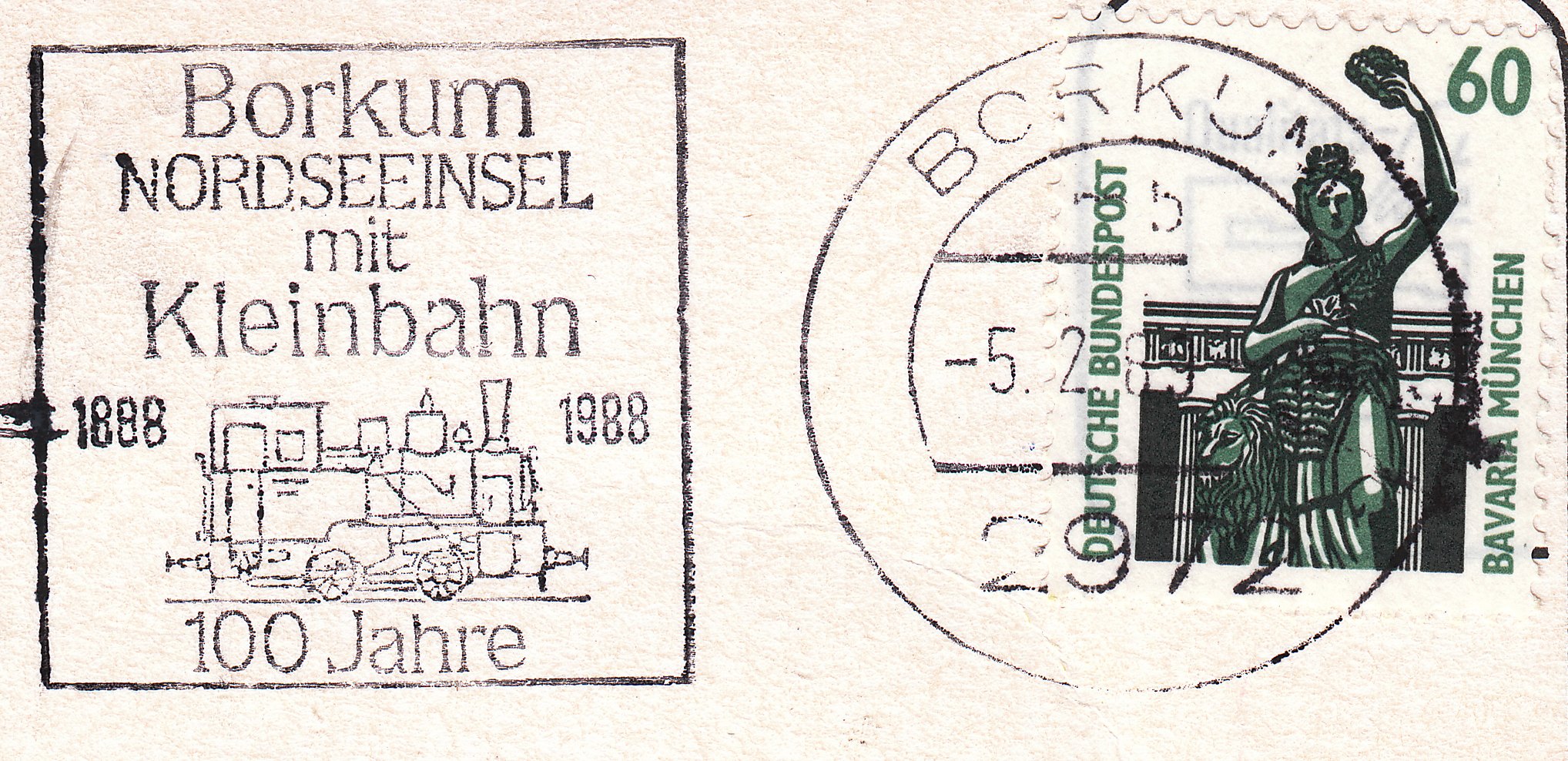 Eine solche Lokomotive diente als Motiv für den Werbeeinsatz des Maschinenstempels, der 1988 zum 100jährigen Bestehen der Borkumer Kleinbahn aufgelegt wurde: