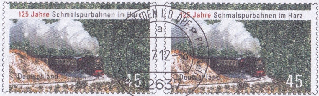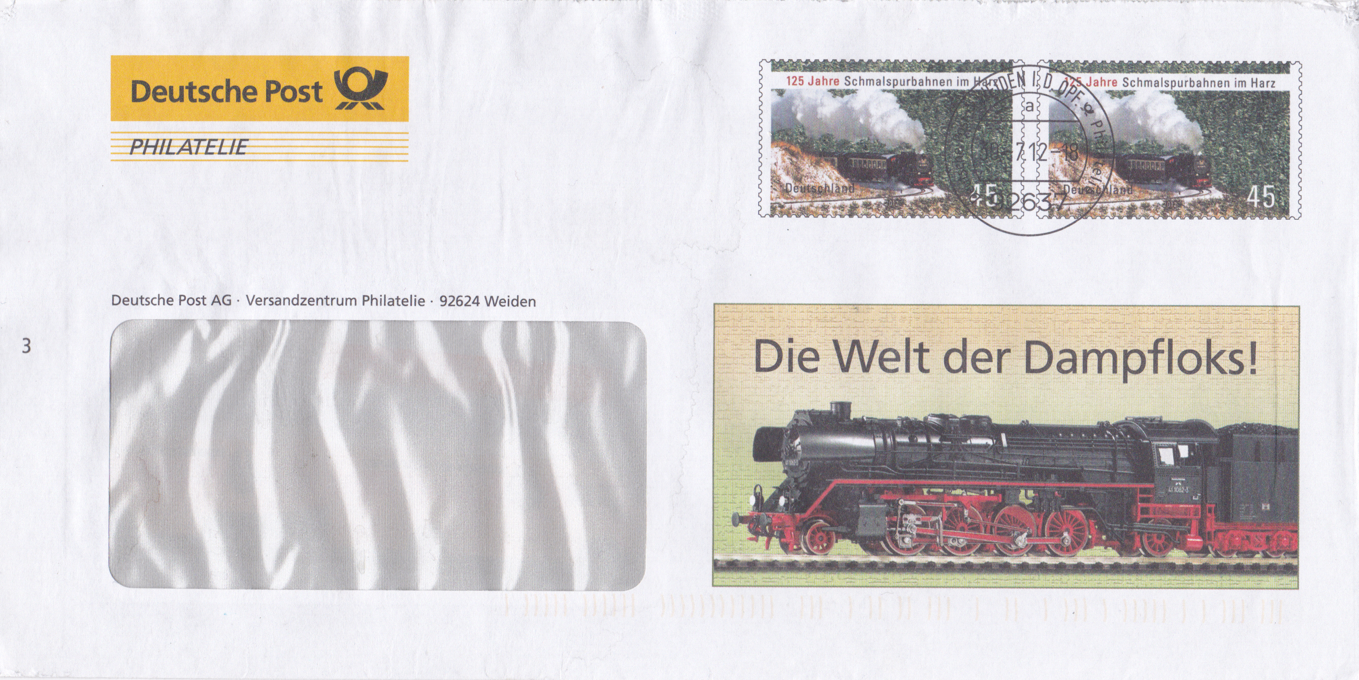 Dieser Ganzsachenumschlag (MiNr EA F612) im Format 229x114 mm hat zwei Wertstempel mit der 45 Cent-Marke "125 Jahre Schmalspurbahnen im Harz" (MiNr 2910). Die Vorausentwertung trägt das Datum "30.-7.12".