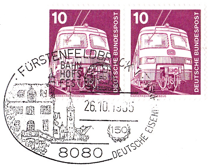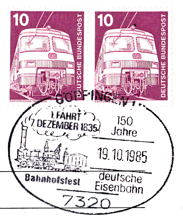 Zum Bahnhofsfest aus Anlass "150 Jahre Deutsche Eisenbahn" gab es am 22.9.1985 in Villingen-Schwenningen diesen Sonderstempel mit einer Diesellokomotive.