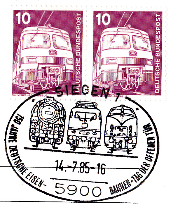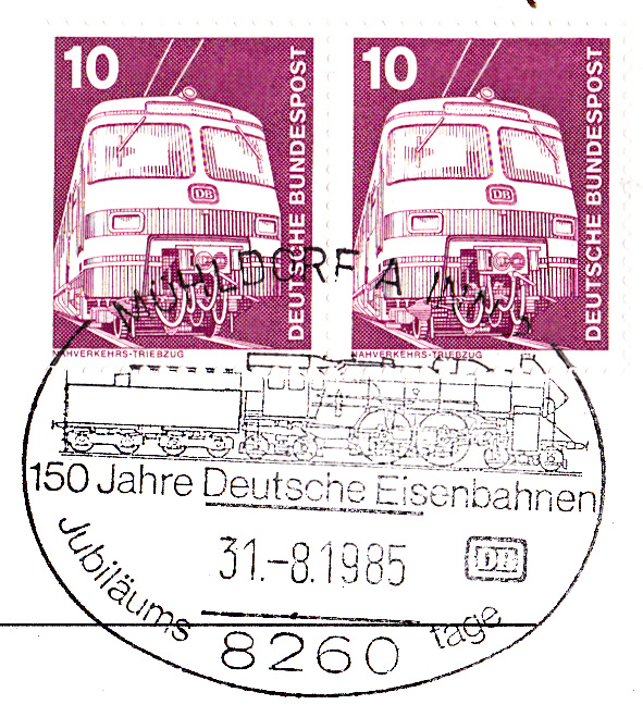 Dieser Sonderstempel vom 1.8.1985 aus Köln zeigt wie der bereist gezeigte SST aus Hamburg das Signet "150 Jahre Deutsche Eisennbahn" und weist auf den "Ausstellungszug" hin.