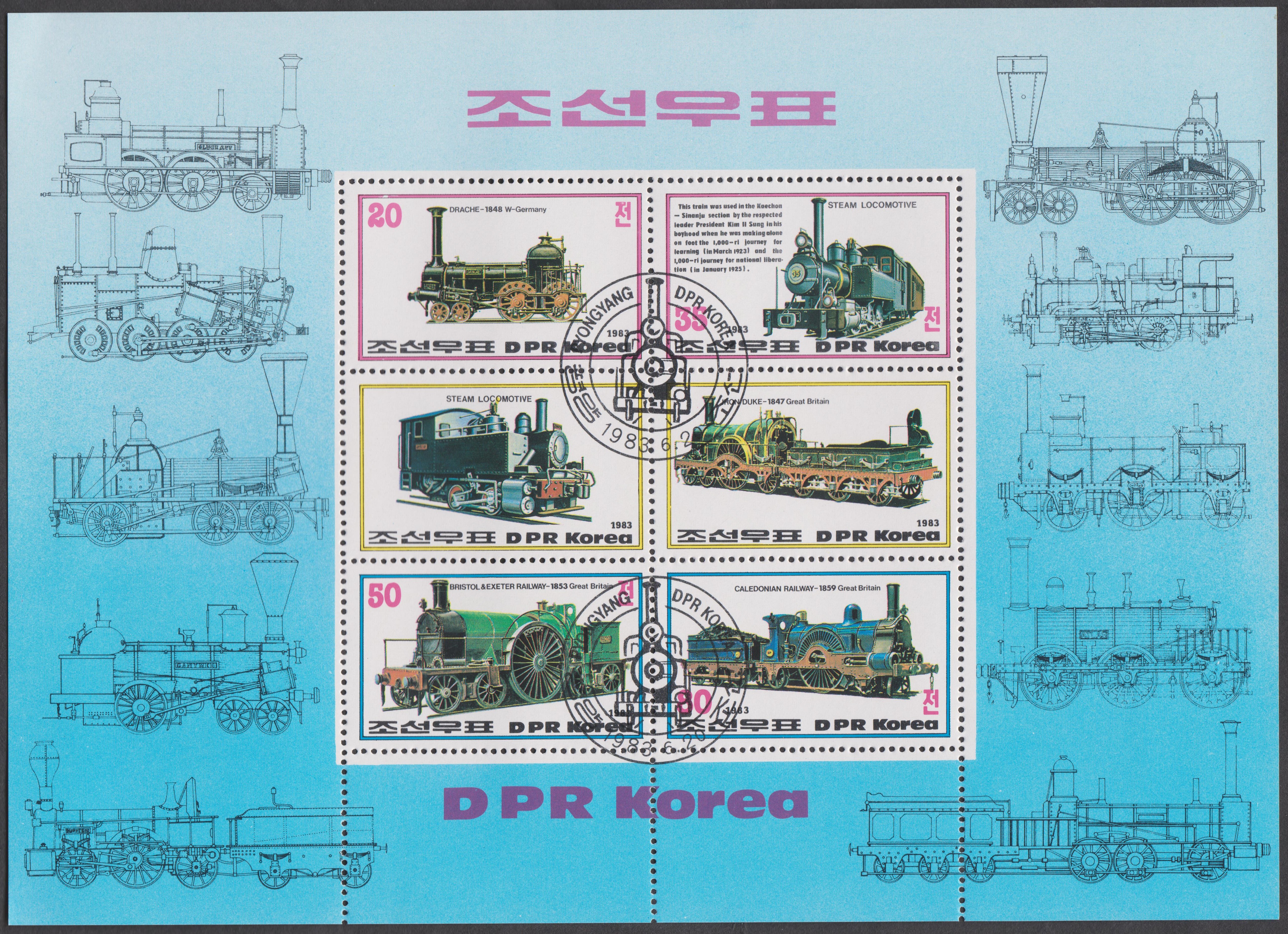 Dieser Block Nordkorea MiNr. 147 A zeigt gleich 6 Dampflokomotiven: