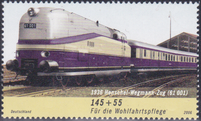 Auf der Wohlfahrtsmarke 2006 zu 145+55 Cent (MiNr 2563) ist der Henschel-Wegmann-Zug 61 001 abgebildet.