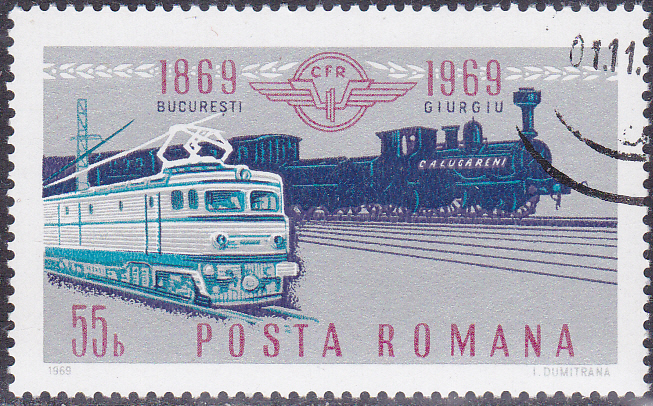 Auf dieser Marke aus Rumänien (MiNr 2803) werden vorne eine Elektrolokomotive (1969) und die rumänische Dampflokomotive Călugăreni (1869) gezeigt.