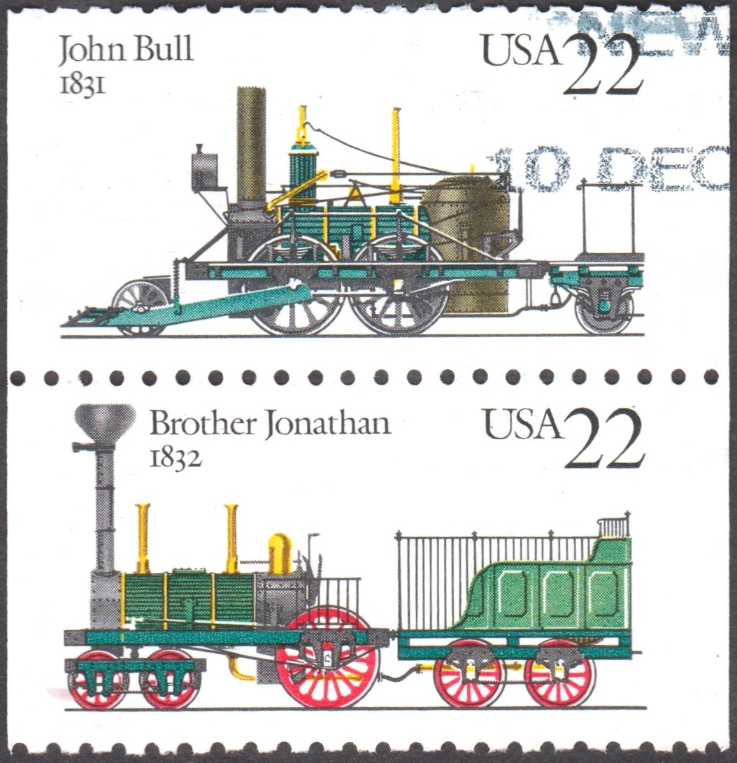 Dargestellt sind die Dampflokomotiven John Bull von 1831 sowie Brother Jonathan von 1832.
