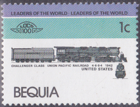 Auf dieser Marke aus Vincent Grenadinen, Bequia (MiNr 1) (die Insel Bequia ist Teil des Staates St. Vincent und die Grenadinen mit etwa 5000 Einwohner und einer Fläche von ungefähr 18 km²) ist eine Aufrisszeichnung einer Dampflokomotive der Challenger-Klasse der Union Pacific Railroad aus dem Jahre 1942 abgebildet.