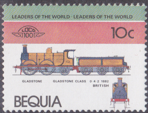 Eine Marke der gleichen Ausgabe aus Bequia (MiNr 5) zeigt eine Aufrisszeichnung einer Dampflokomotiven dieser "Gladstone Glass" aus dem Jahre 1882.
