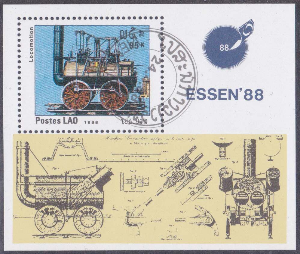 Die bereits mehrfach auf anderen Marken hier gezeigte "Locomotion 1" von George Stephenson sehen wir auch auf der Marke (MiNr 1097) im Block aus Laos (MiNr Block 123) zur Briefmarkenmesse Essen.