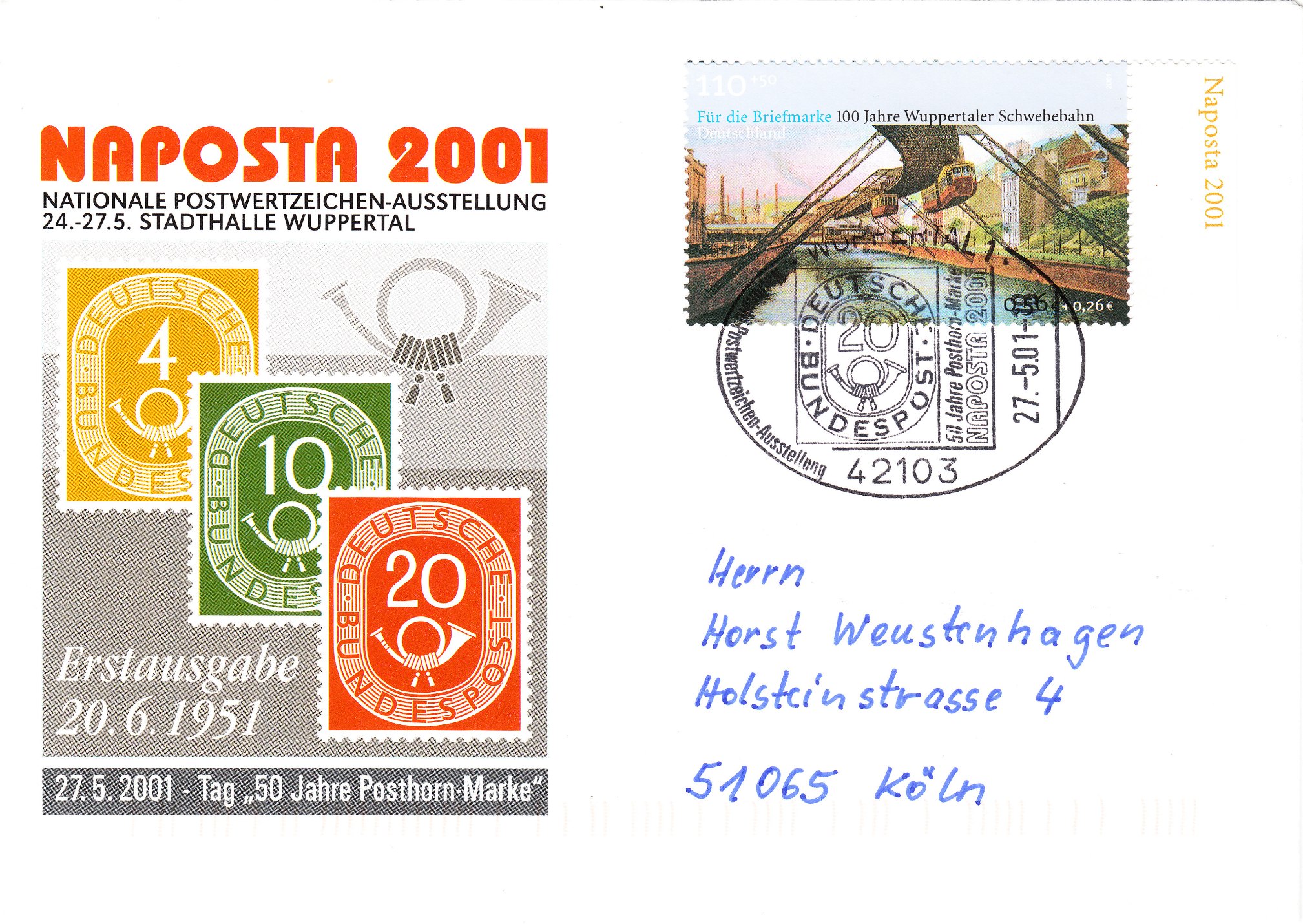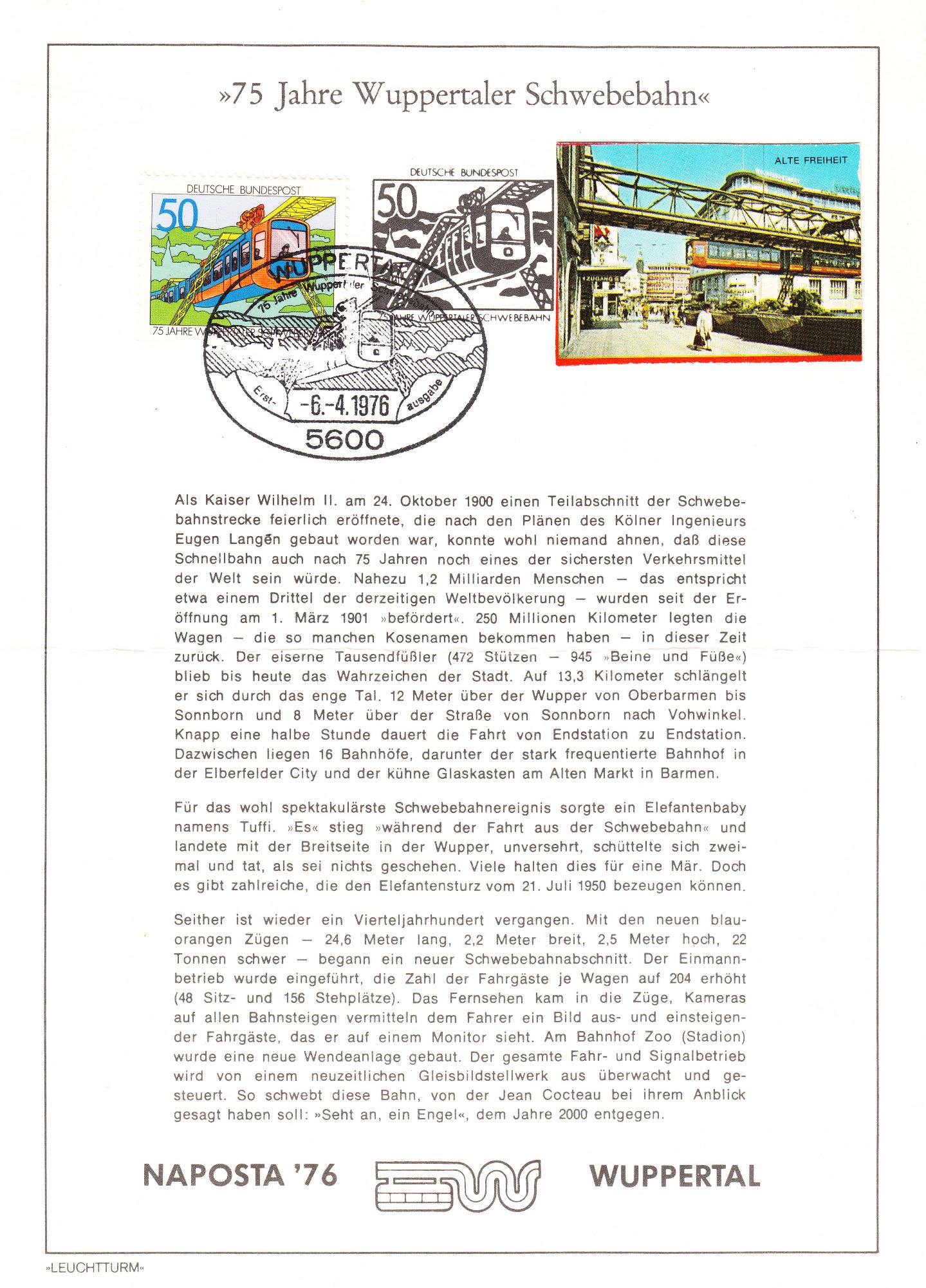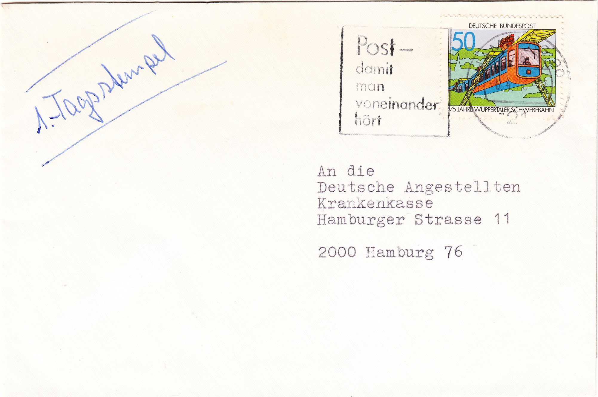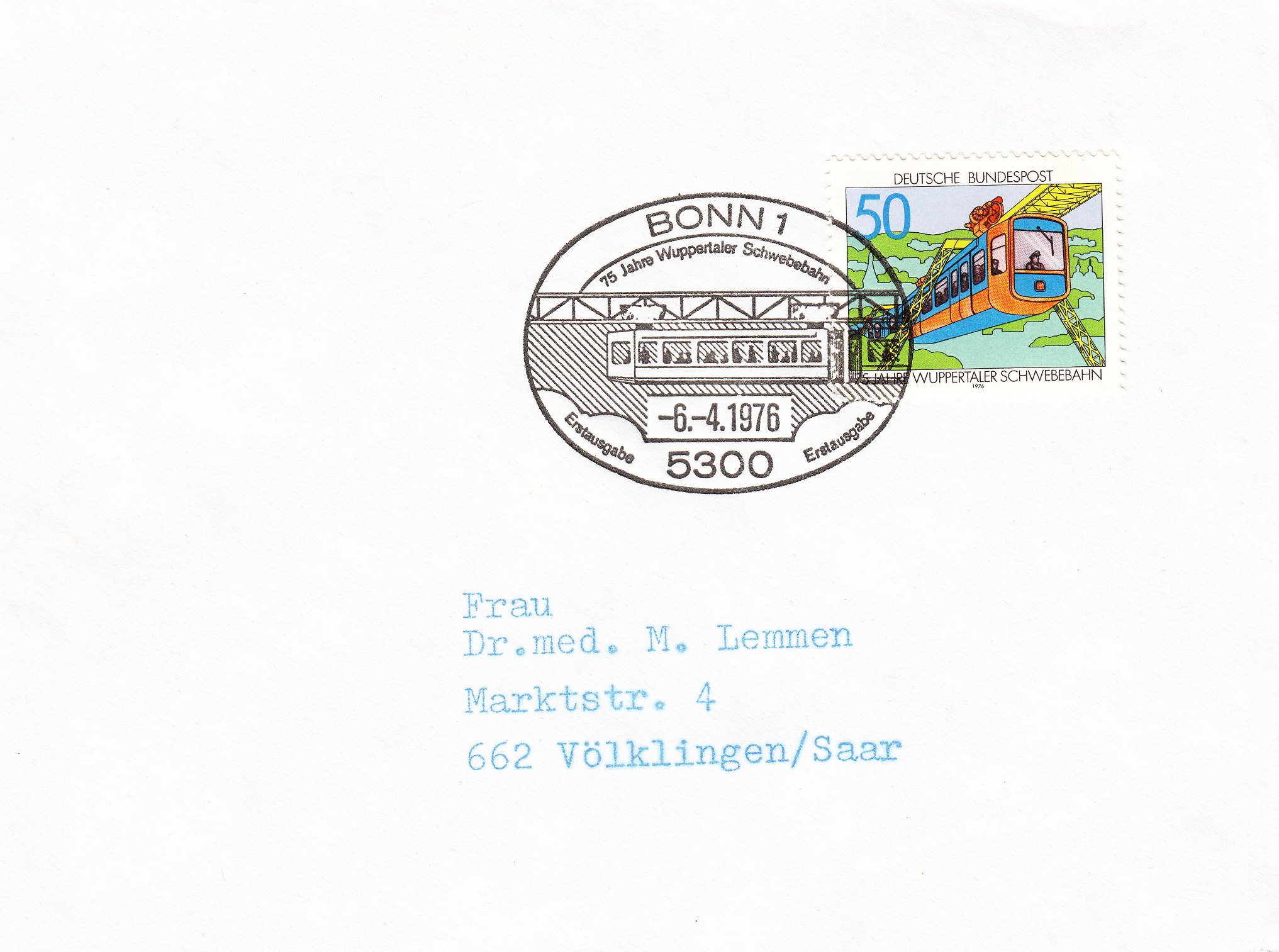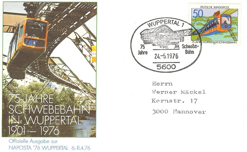 Hier ein Beleg mit einer EF der Sondermarke "75 JAHRE WUPPERTALER SCHWEBEBAHN", am 06.04.1976 als Ersttag per Maschinenstempel in Hamburg entwertet:
