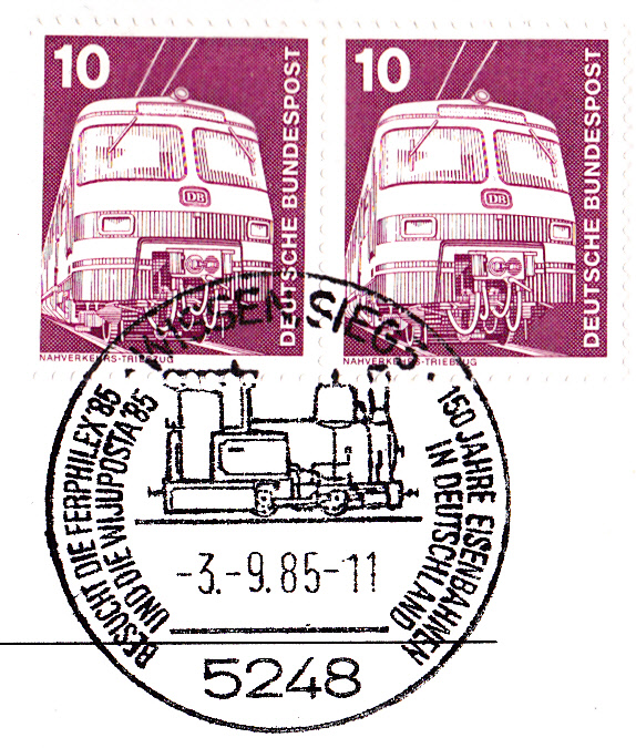 Sonderstempel vom 27.10.1985 aus Netphen 1 zum Jubiläum "150 Jahre Deutsche Eisenbahn" und zum Zag der Briefmarke. Im Stempel wird eine Dampflokomotive gezeigt.