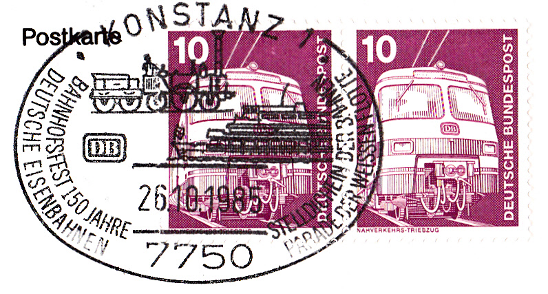 Sonderstempel vom 26.10.1985 aus Konstanz zum Bahnhofsfest aus Anlass 150 Jahre Deutsche Eisenbahnen. Im Stempelbild ist auch die Lokomotive "Adler" zu sehen.