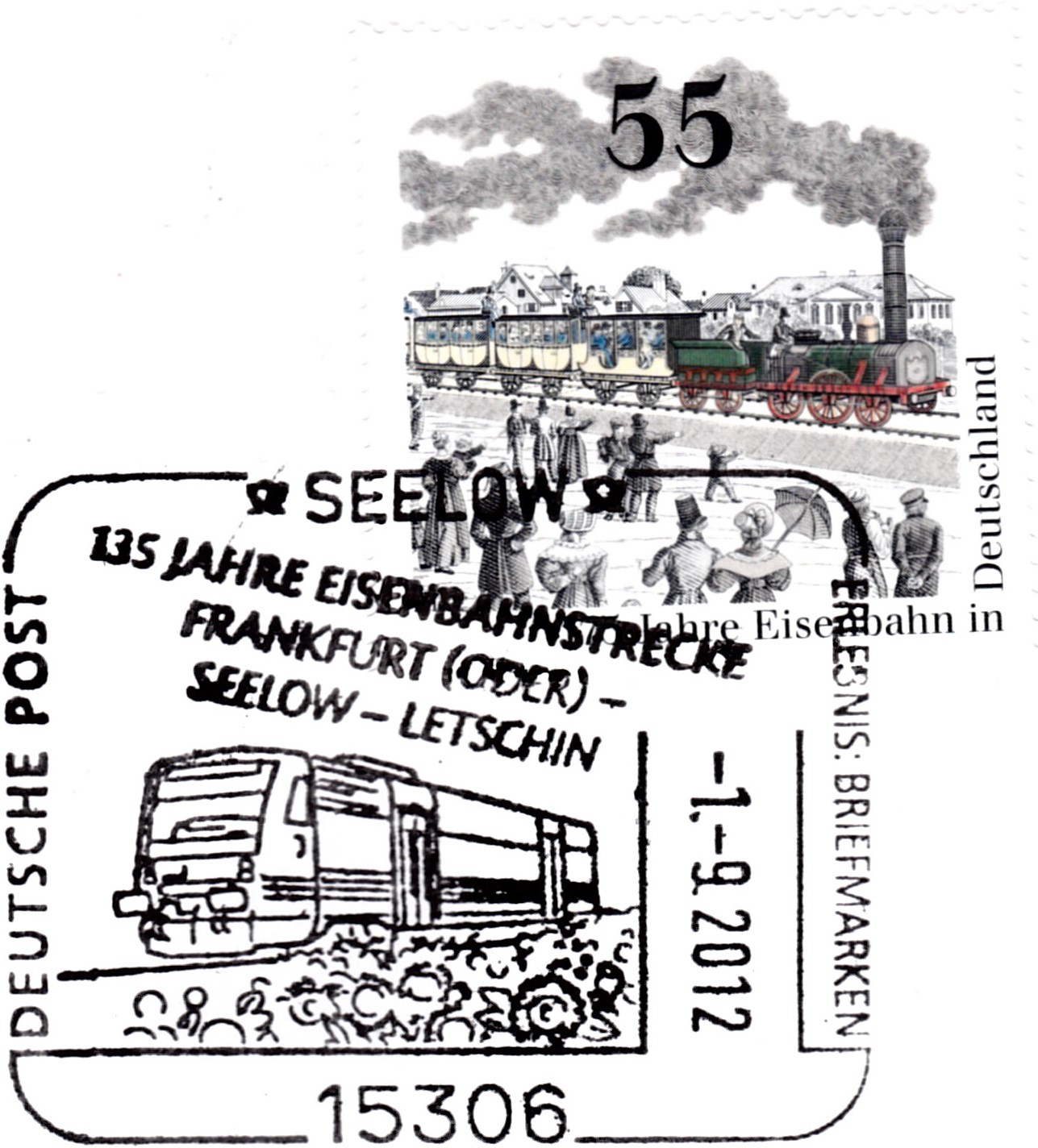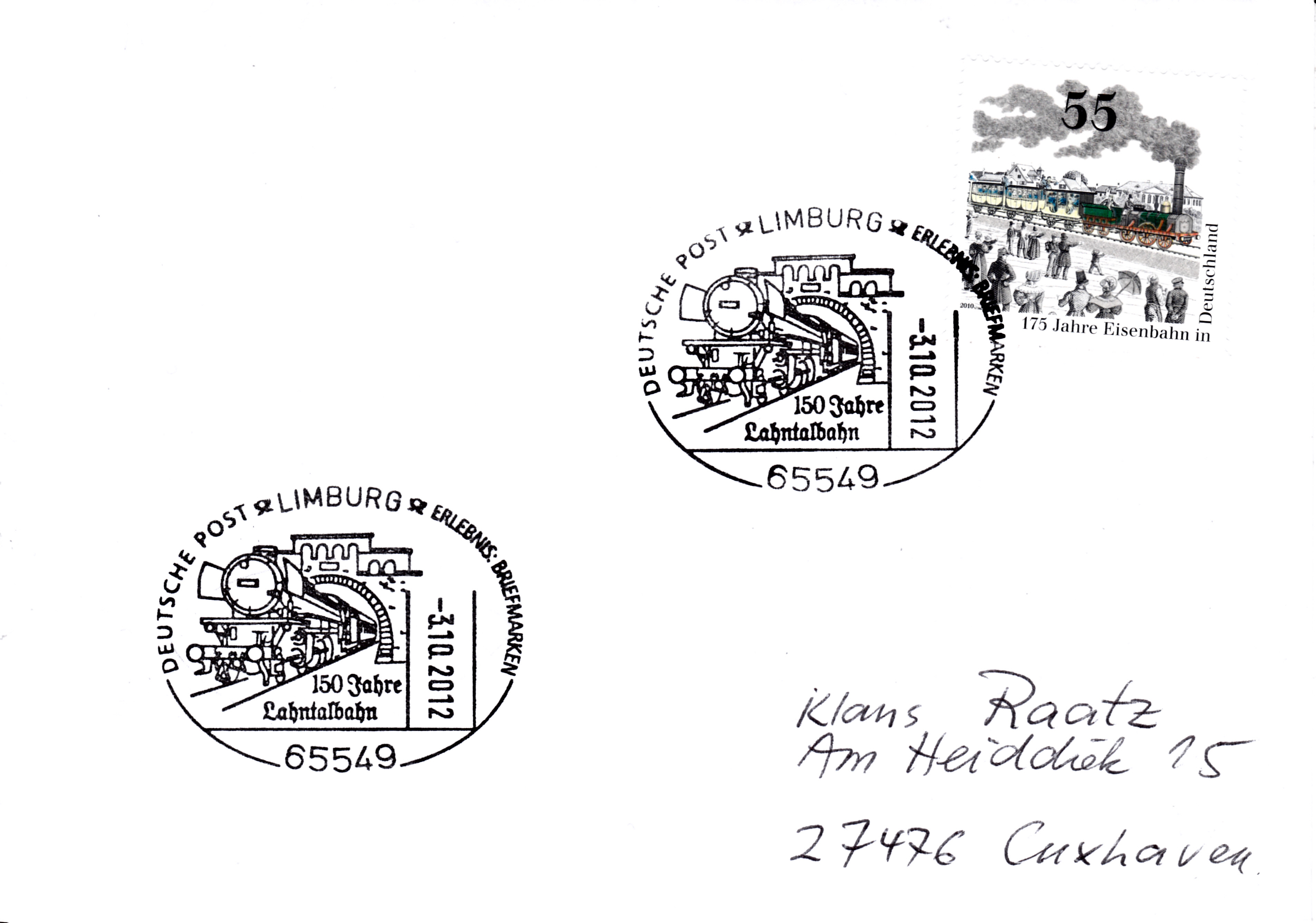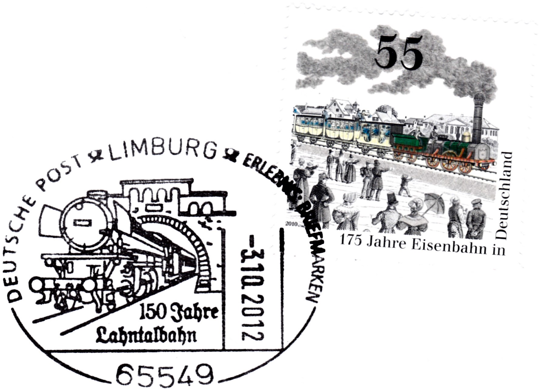 Dieser Sonderstempel aus Limburg vom 3.10.2012 wurde aus Anlass "150 Jahre Lahntalbahn" eingesetzt.