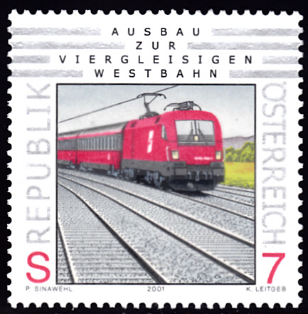 Auf dieser Marke aus Österreich (MiNr 2352) zum viergleisigen Ausbau der Westbahn wird ein Zug mit einer Lokomotive "Taurus" auf einem neuen Streckenabschnitt gezeigt.
