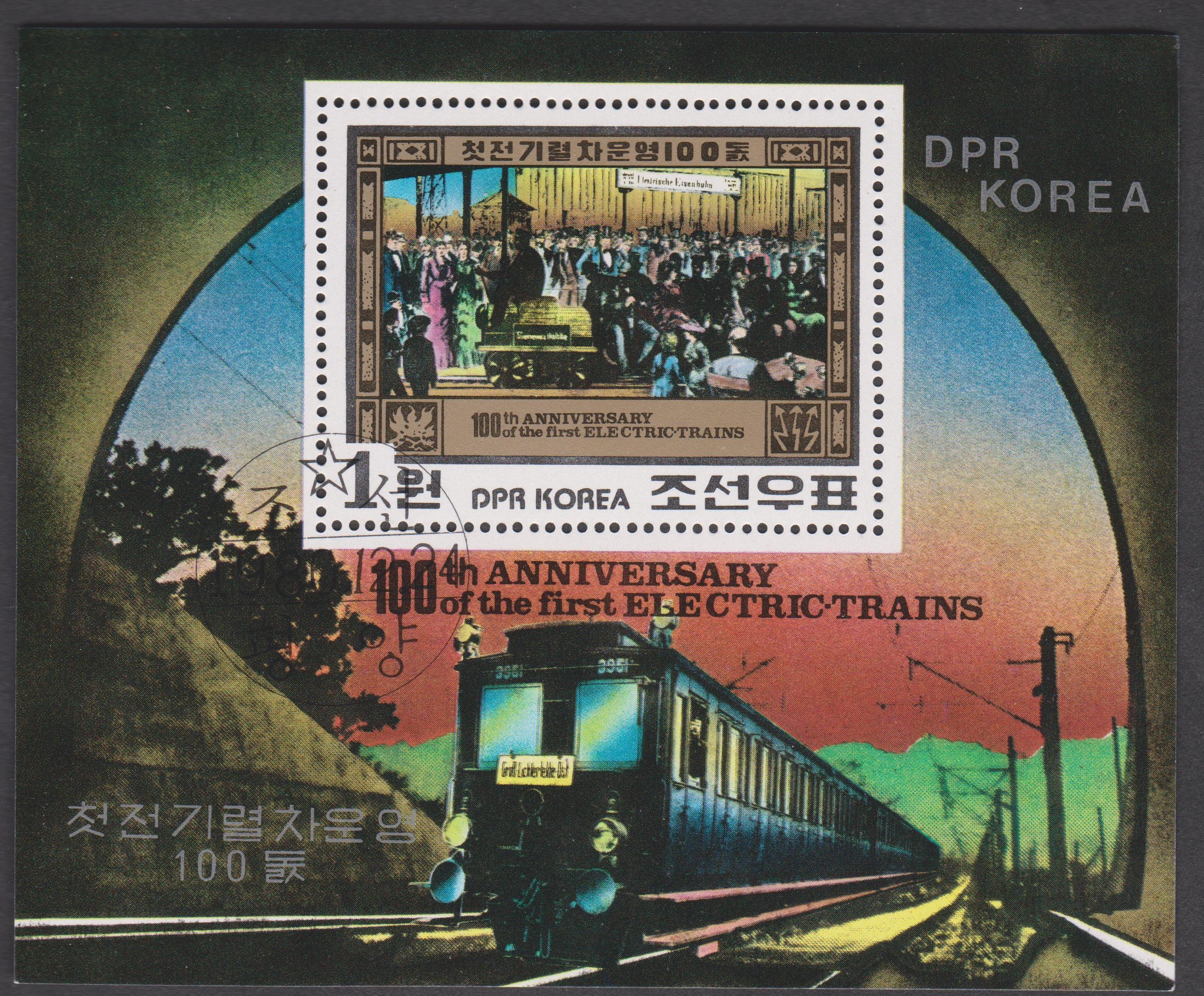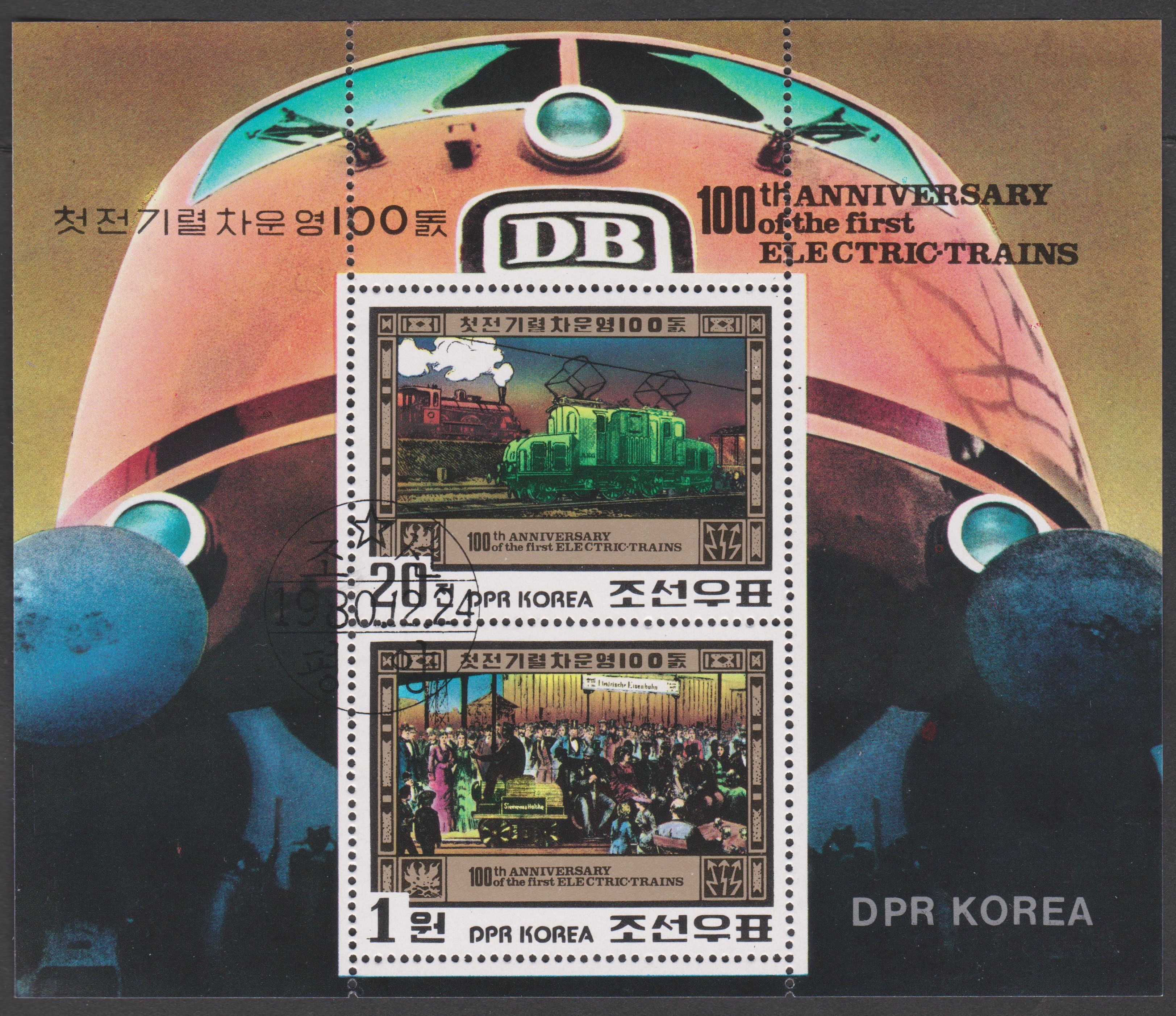 Nordkorea Block 2069 sowie MiNr. 2068 - 2069 erschienen am 24.12.1980 zum Thema 100 Jahre elektrische Eisenbahn: