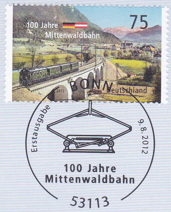 Diese Marke "100 Jahre Mittenwaldbahn" (MiNr 2951) wurde mit dem Ersttagsonderstempel Bonn gestempelt.