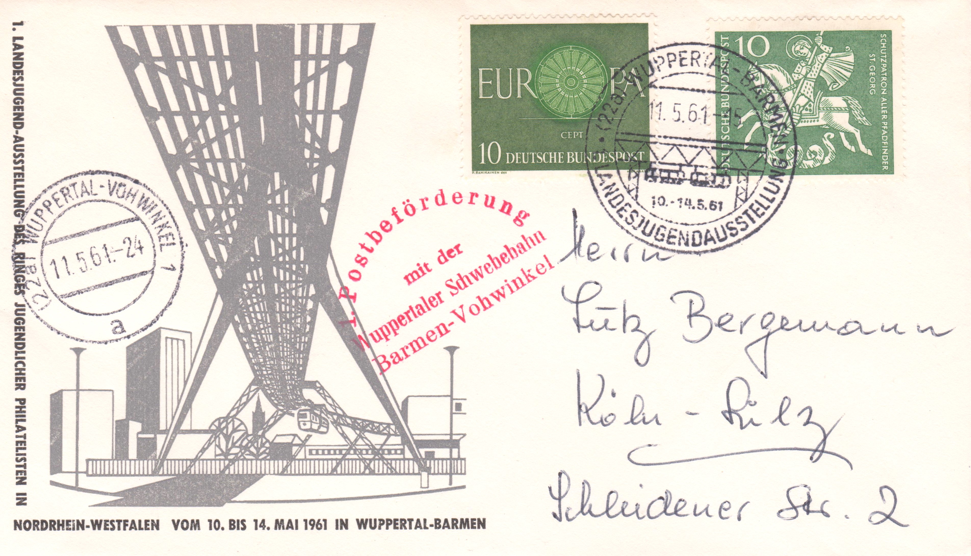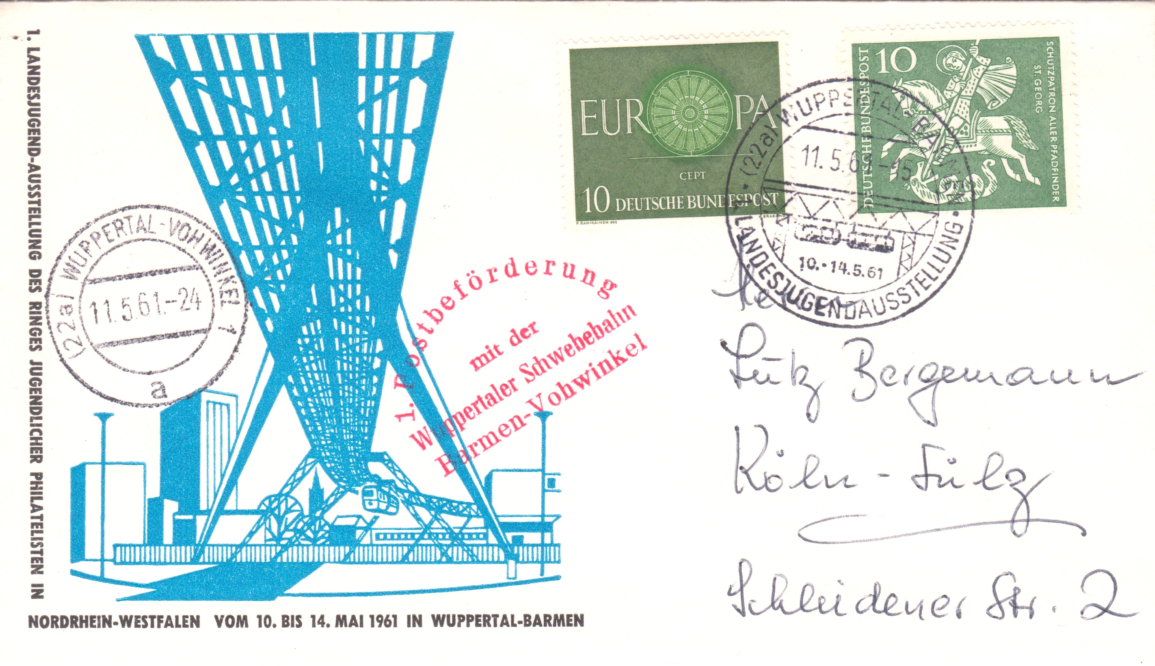 Die 1. Postbeförderung mit der Wuppertaler Schwebebahn erfolgte am 10.05.1961 von WUPPERTAL-BARMEN nach WUPPERTAL-VOHWINKEL.