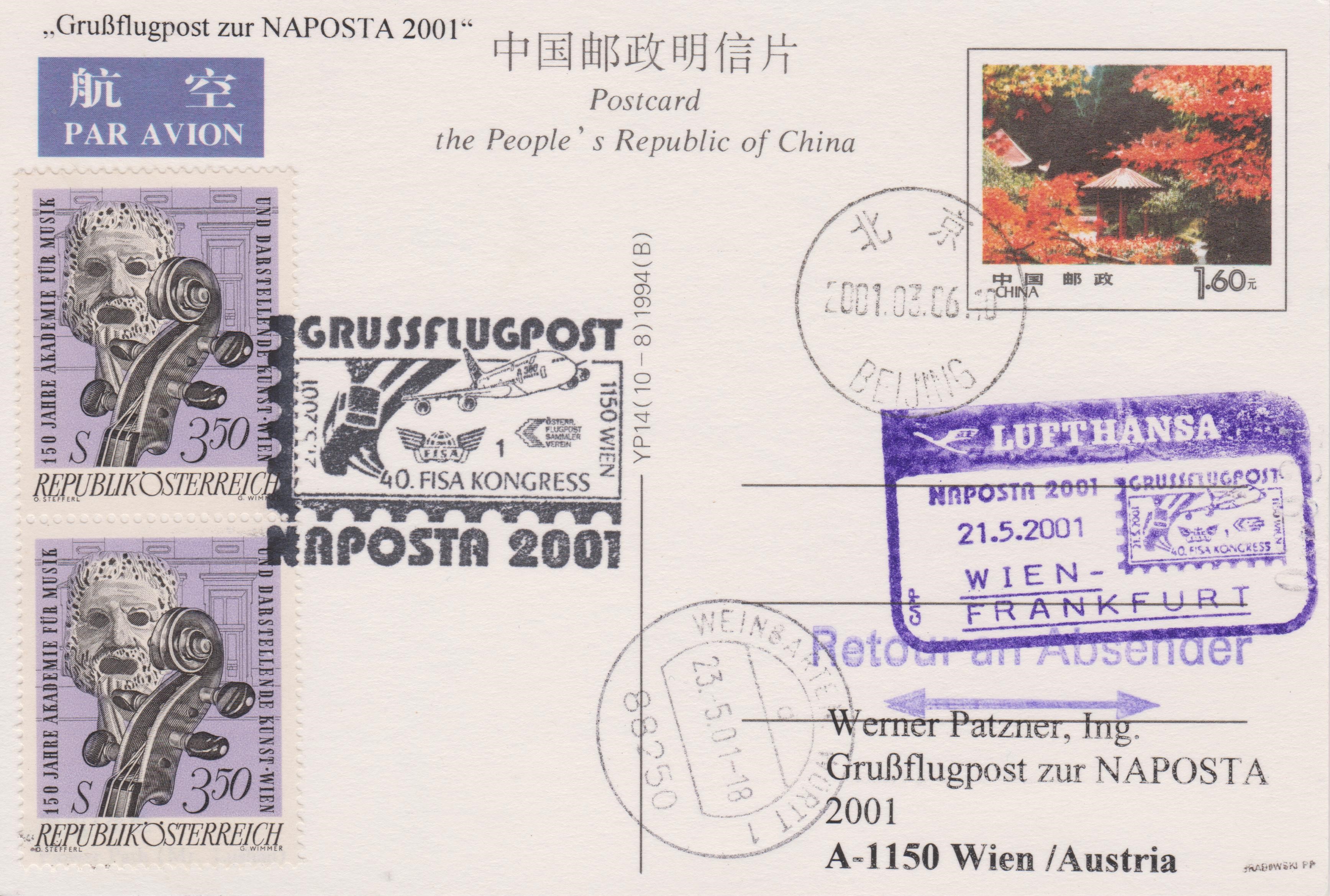 GRUSSFLUGPOST NAPOSTA 2001: Postkarte, aufgegeben am 06.03.2001 in BEIJING in China, adressiert nach 1150 WIEN, wo die österreichische Zusatzfrankatur am 21.05.2001 mit einem Sonderstempel entwertet wurde: