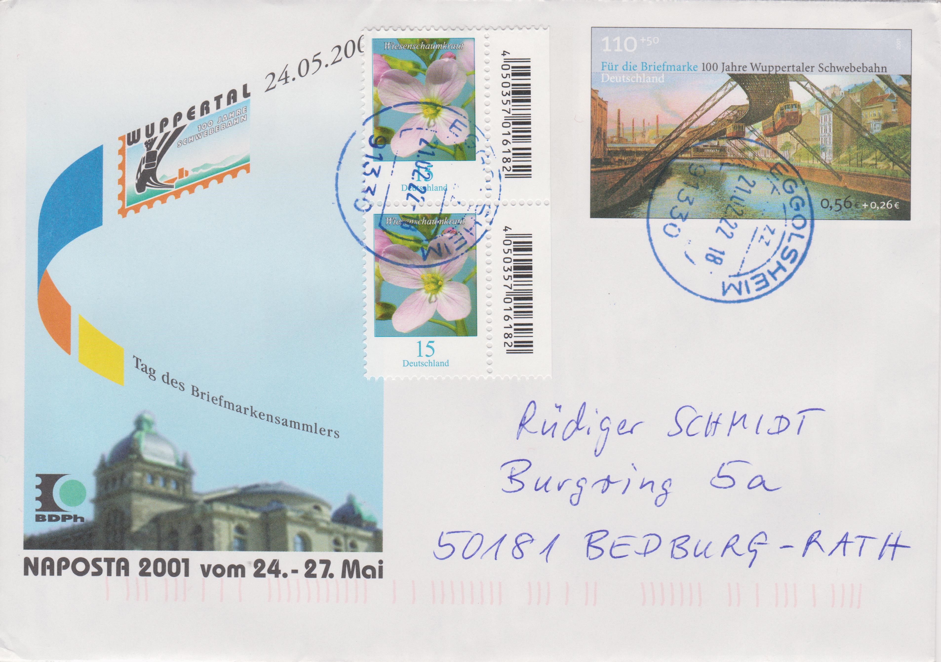 Spätverwendung der zur Naposta 2001 zum Thema 100 Jahre Wuppertaler Schwebebahn erschienenen Ganzsache Bund USo 28 mit Zusatzfrankatur am 21.02.2022: