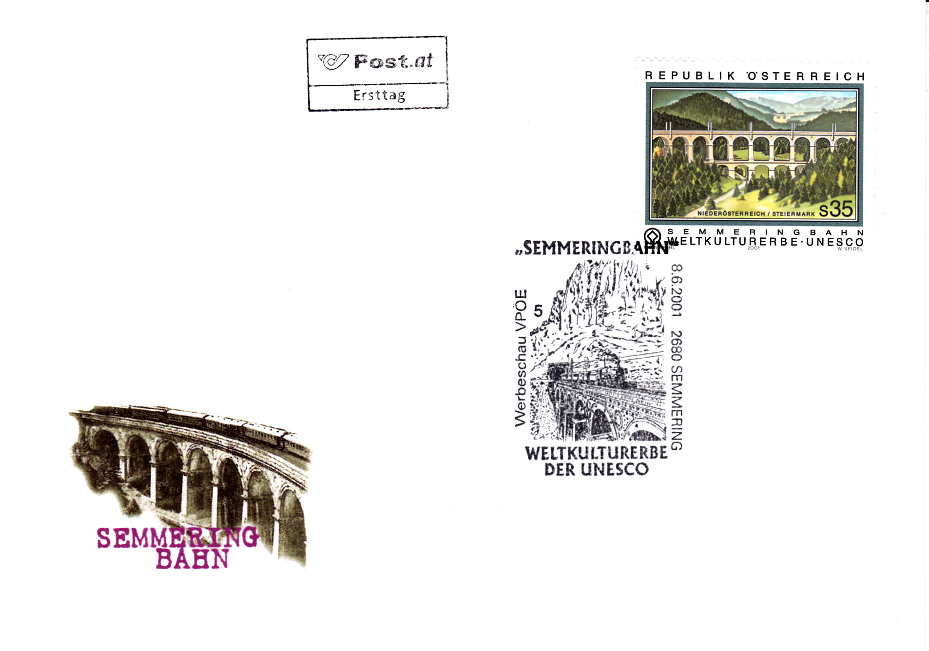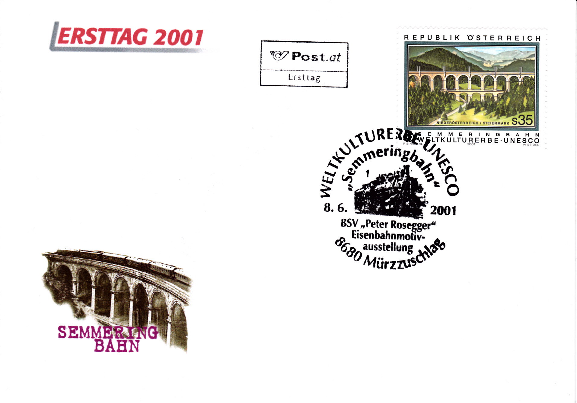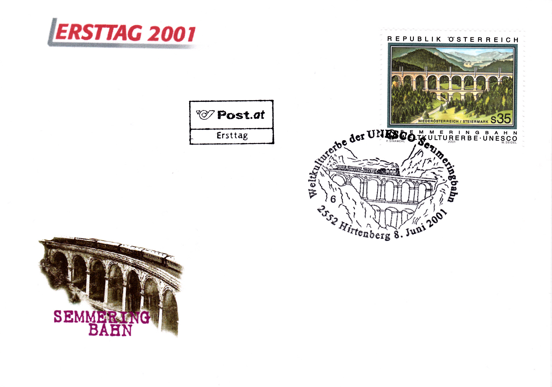 Auf dieser Marke aus Österreich (MiNr 3233) sehen wir einen Zug der Semmeringbahn mit Dampfloks der Reihen 95 und 33 auf dem Höllgrabenviadukt (um 1925).